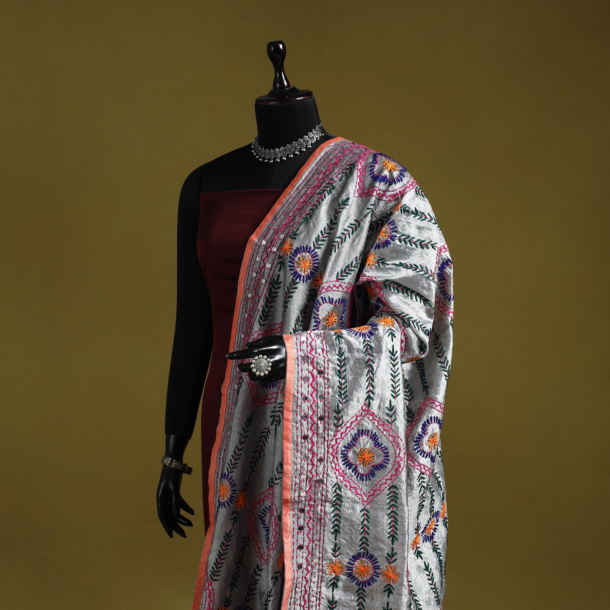 Add charm to your outfit with this grey chapa work hand-embroidery dupatta in chanderi silk. Featuring traditional motifs, it is created by skilled artisans from Ranihati in West Bengal. The intricate threadwork adds depth and beauty, making it perfect for festive gatherings, family functions and cultural celebrations.