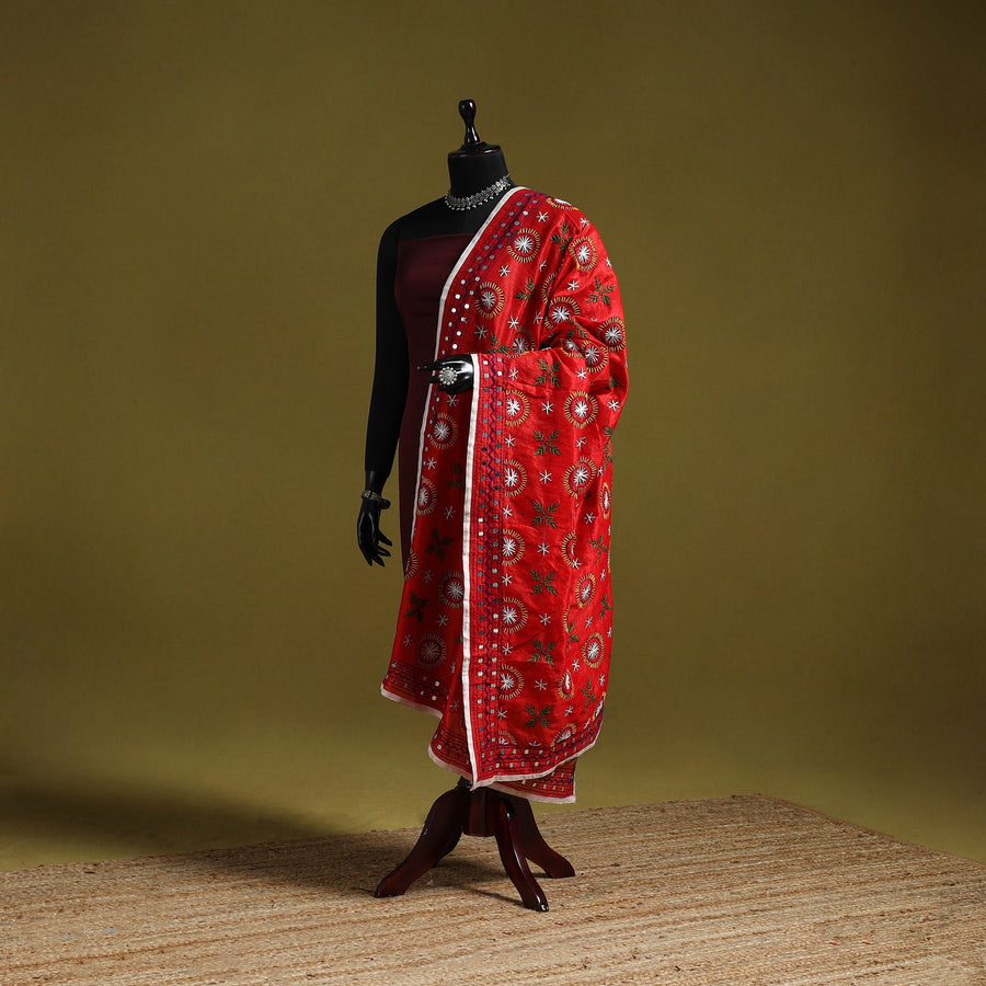 Add charm to your outfit with this red chapa work hand-embroidery dupatta in chanderi silk. Featuring traditional motifs, it is created by skilled artisans from Ranihati in West Bengal. The intricate threadwork adds depth and beauty, making it perfect for festive gatherings, family functions and cultural celebrations.