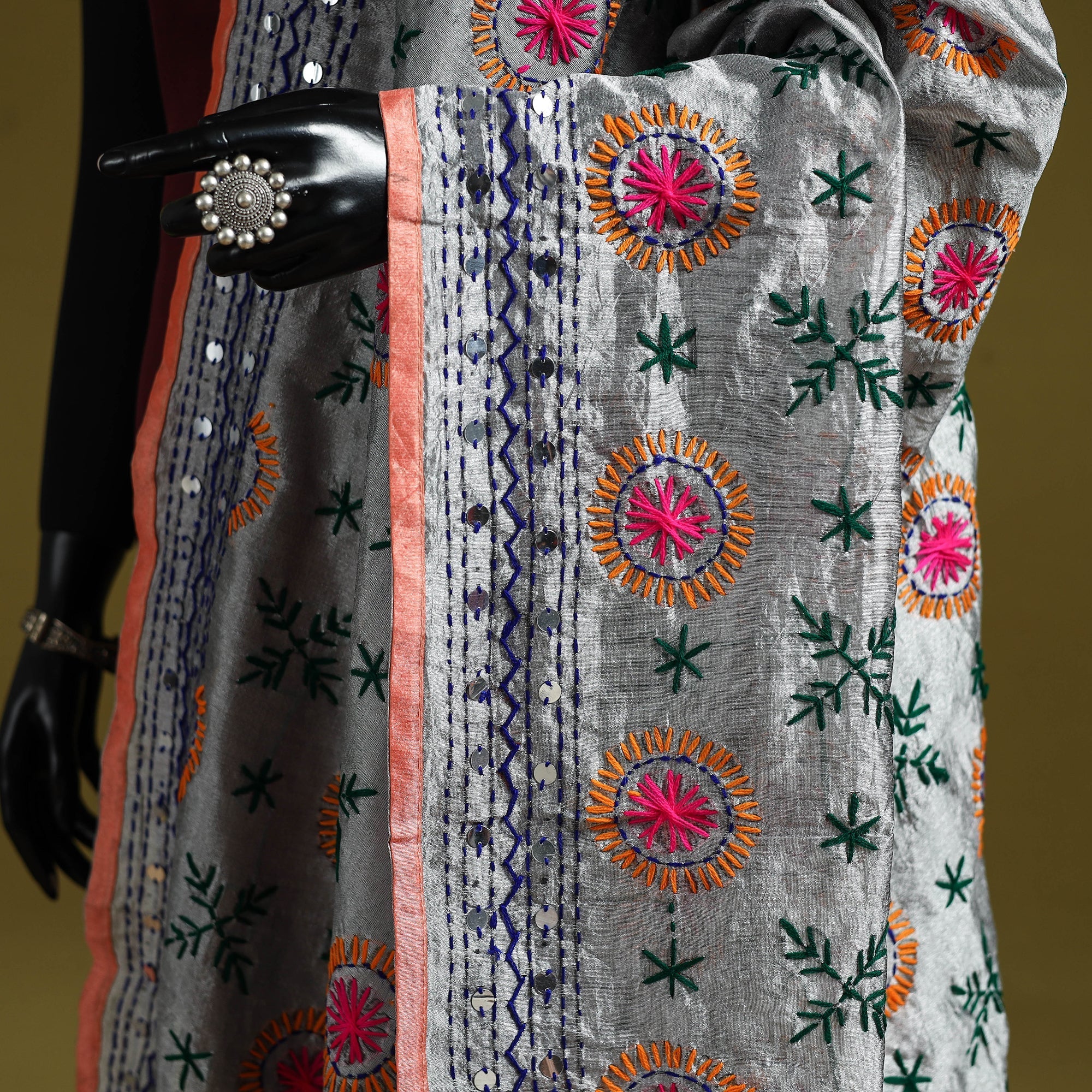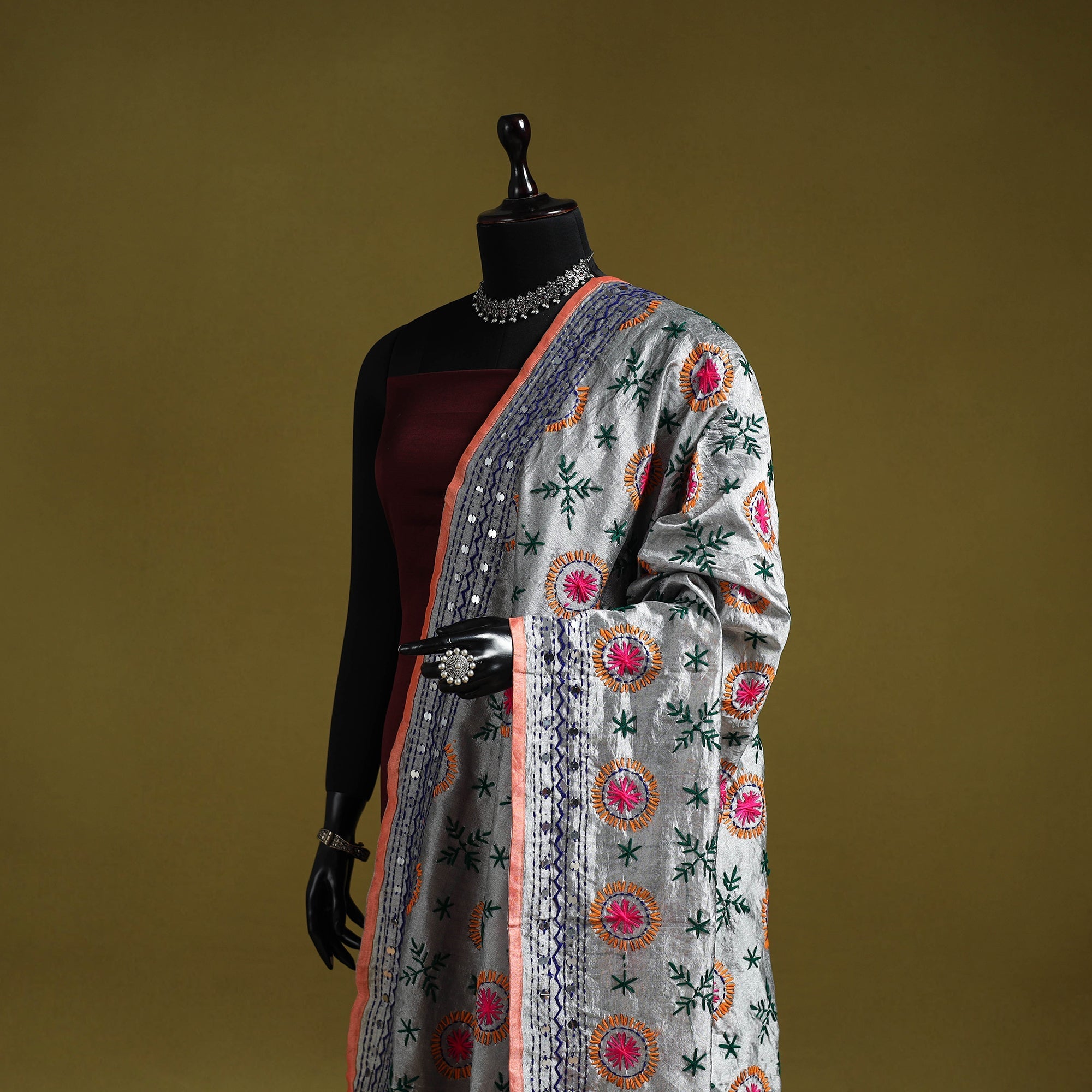 Add charm to your outfit with this grey chapa work hand-embroidery dupatta in chanderi silk. Featuring traditional motifs, it is created by skilled artisans from Ranihati in West Bengal. The intricate threadwork adds depth and beauty, making it perfect for festive gatherings, family functions and cultural celebrations.