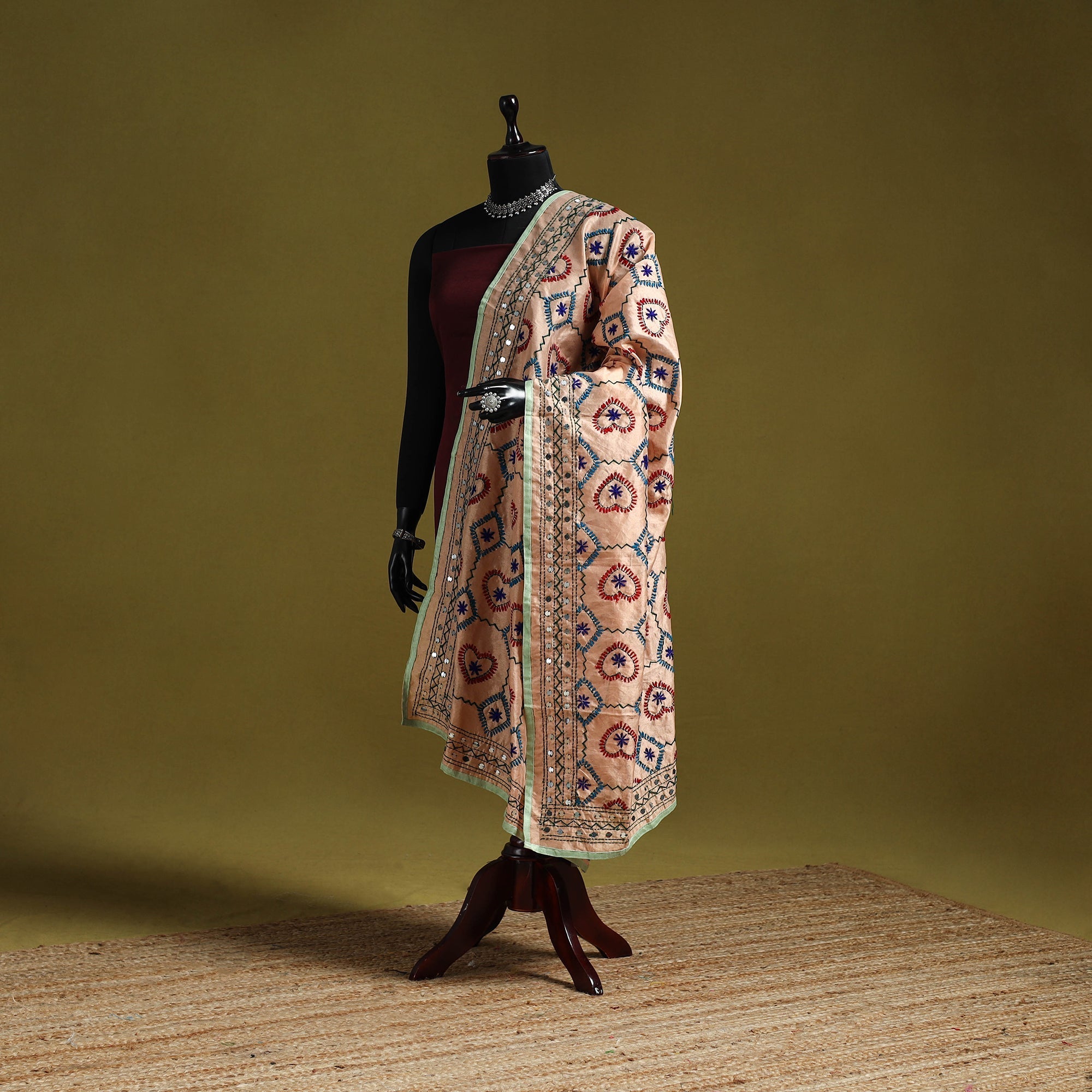 Peach - Ranihati Chapa Work Chanderi Silk Hand Embroidery Dupatta 114