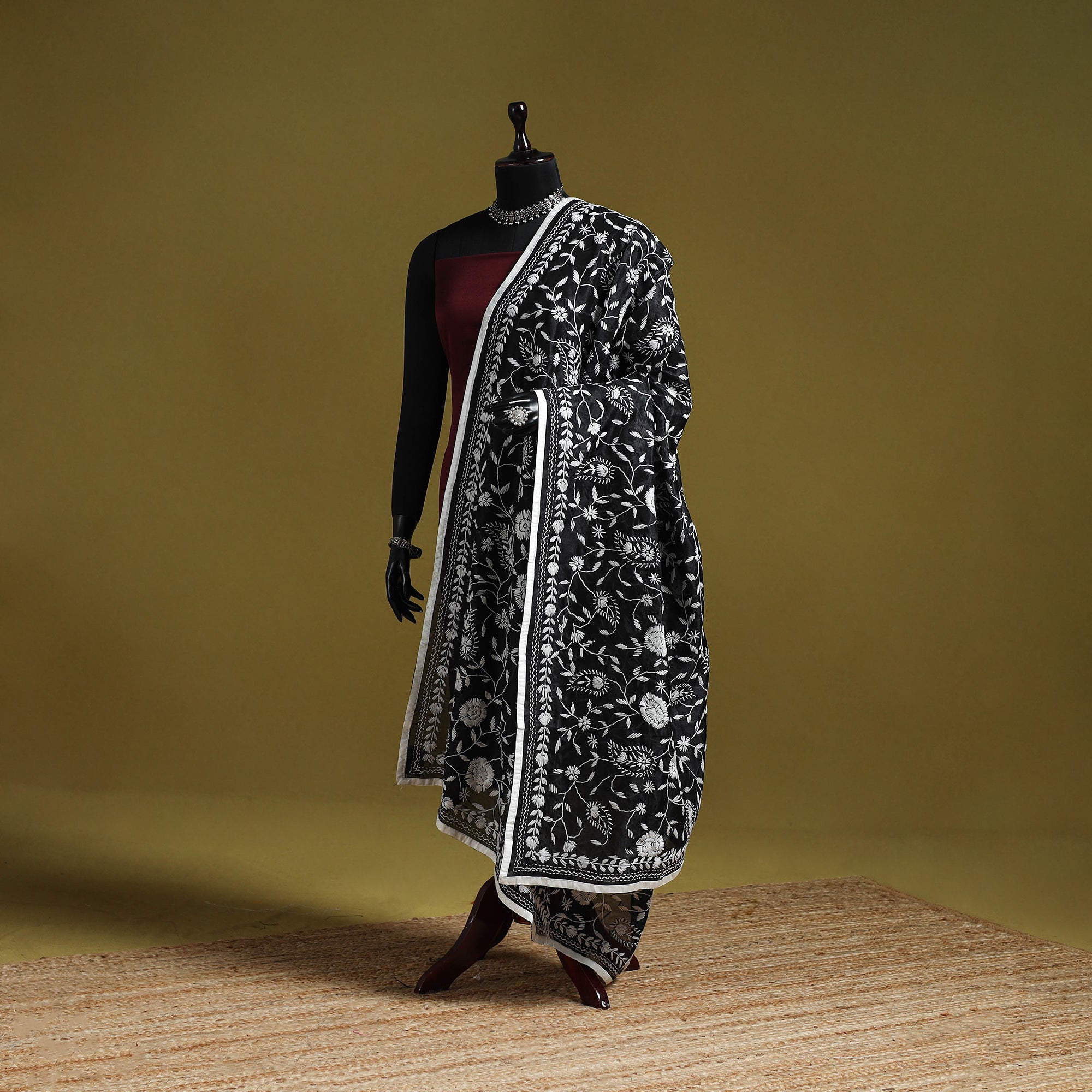 Black - Ranihati Chapa Work Chanderi Silk Hand Embroidery Dupatta 133