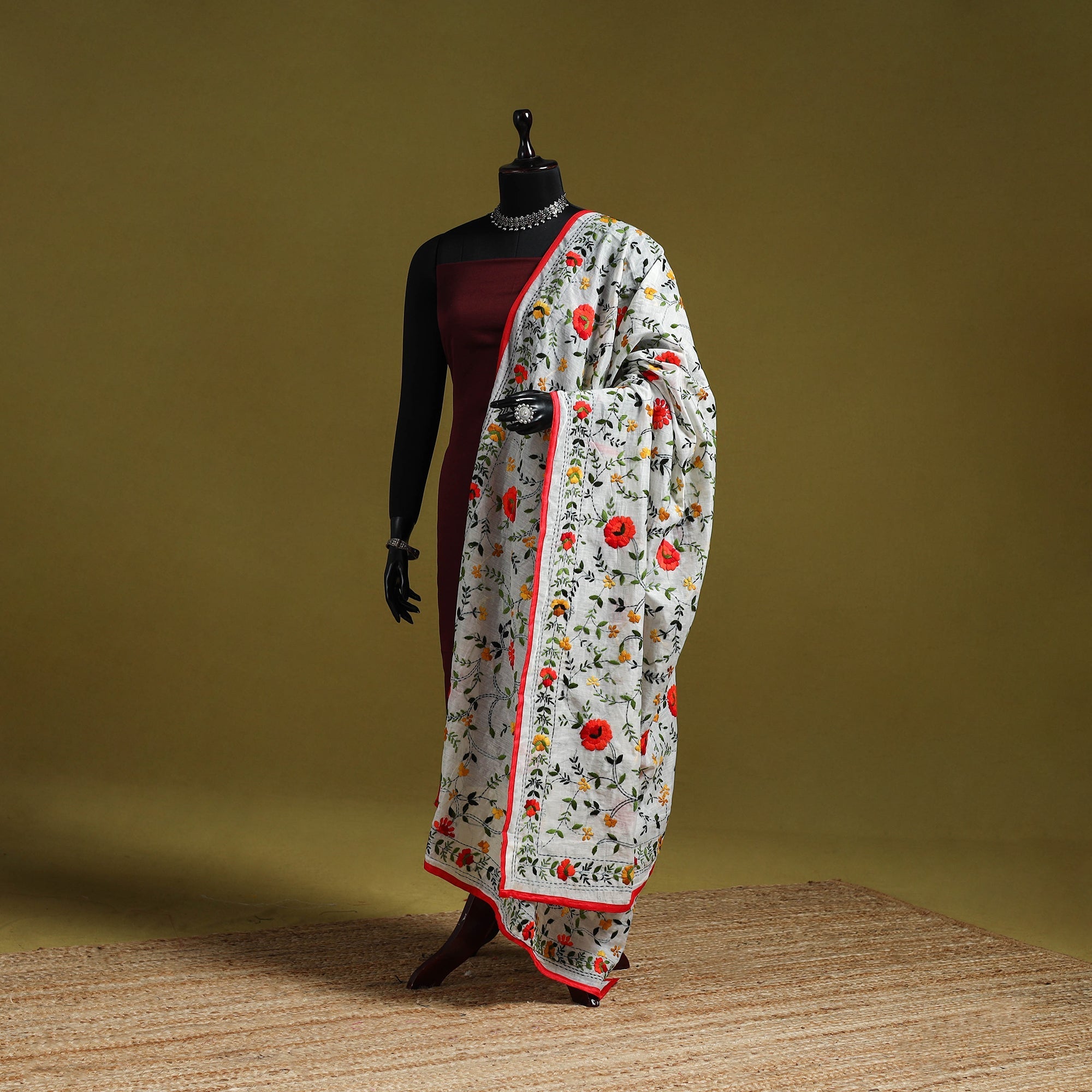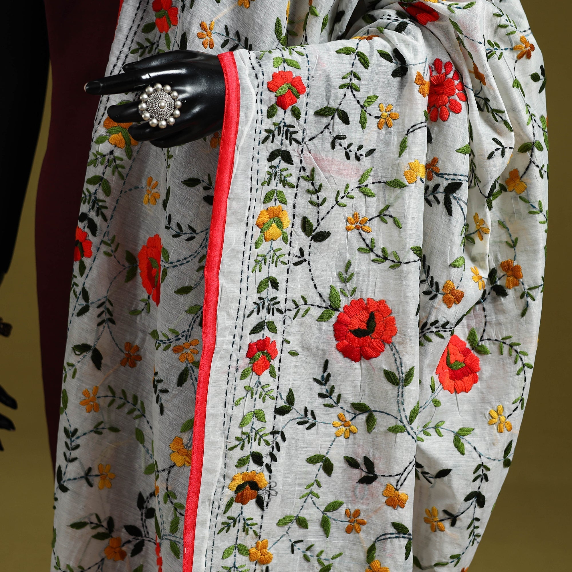 White - Ranihati Chapa Work Chanderi Silk Hand Embroidery Dupatta 131