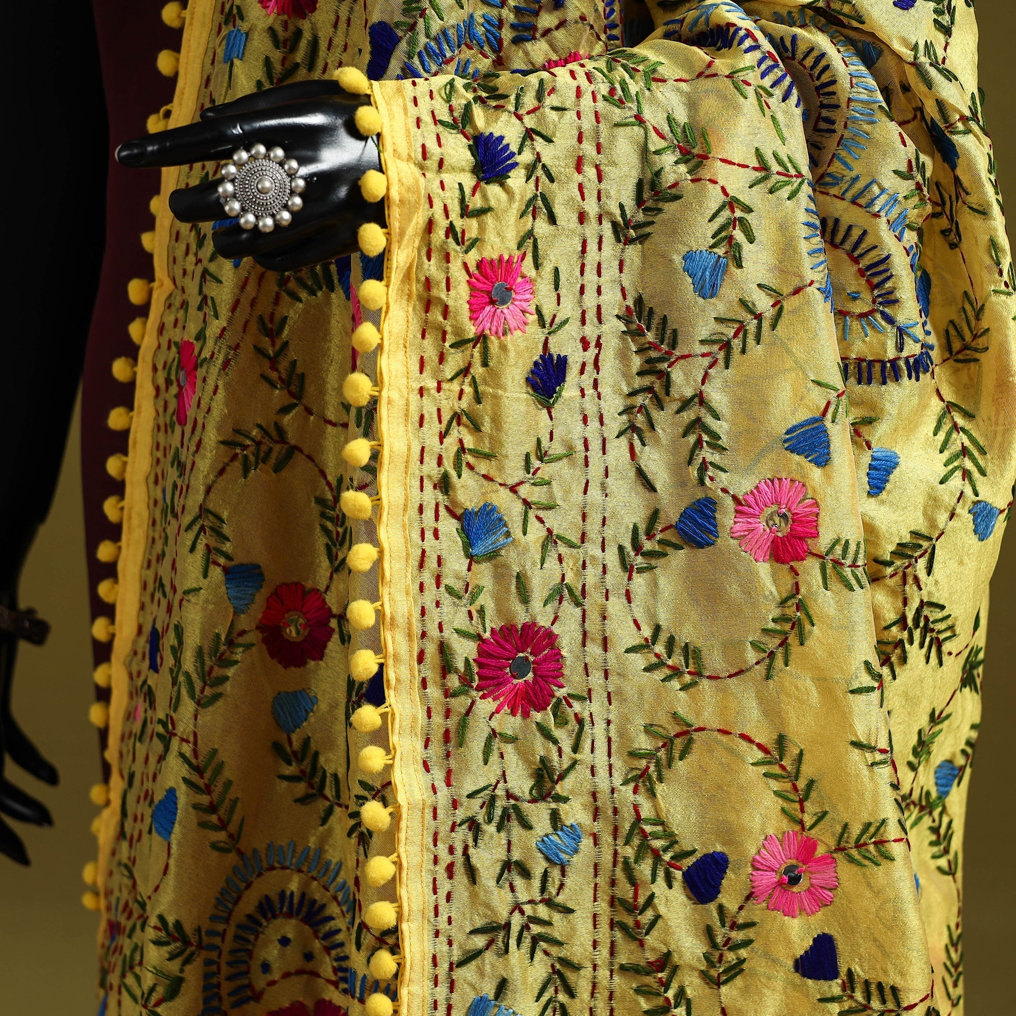 Add charm to your outfit with this yellow chapa work hand-embroidery dupatta with pom pom in chanderi silk. Featuring traditional motifs, it is created by skilled artisans from Ranihati in West Bengal. The intricate threadwork adds depth and beauty, making it perfect for festive gatherings, family functions, and cultural celebrations.