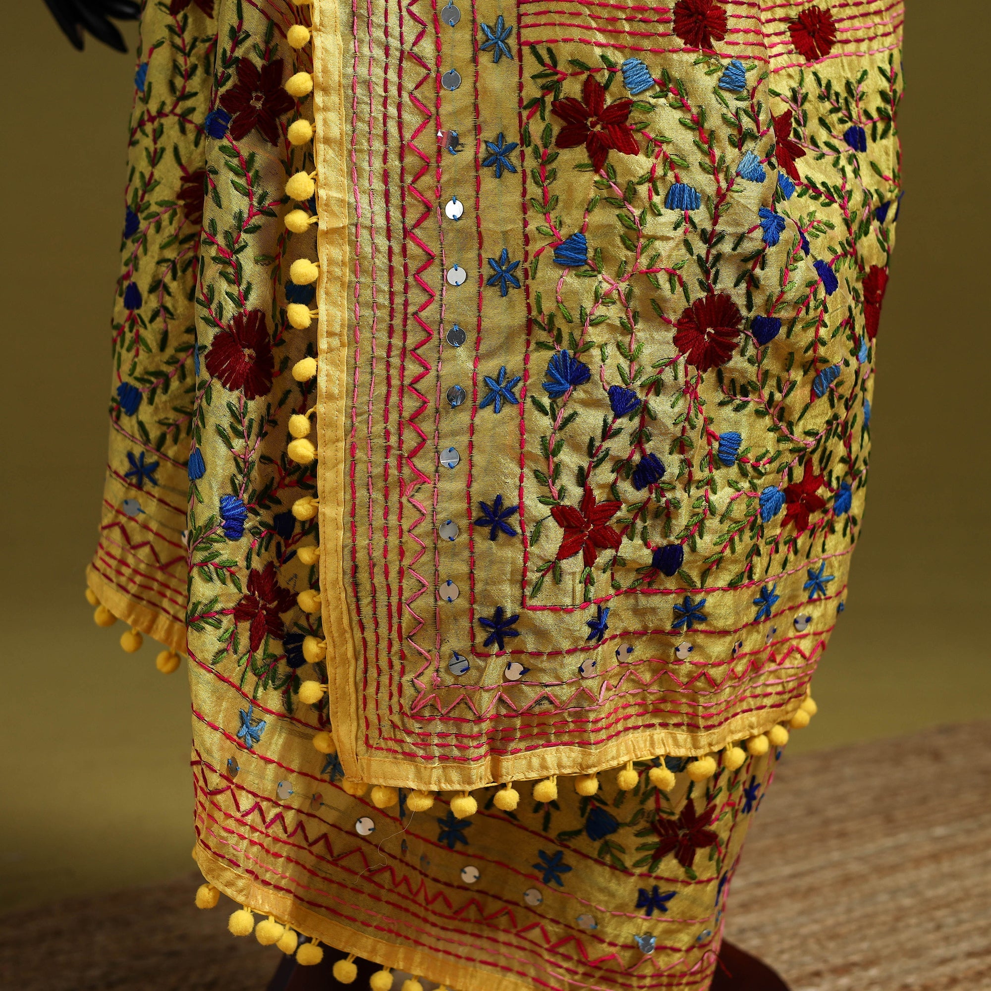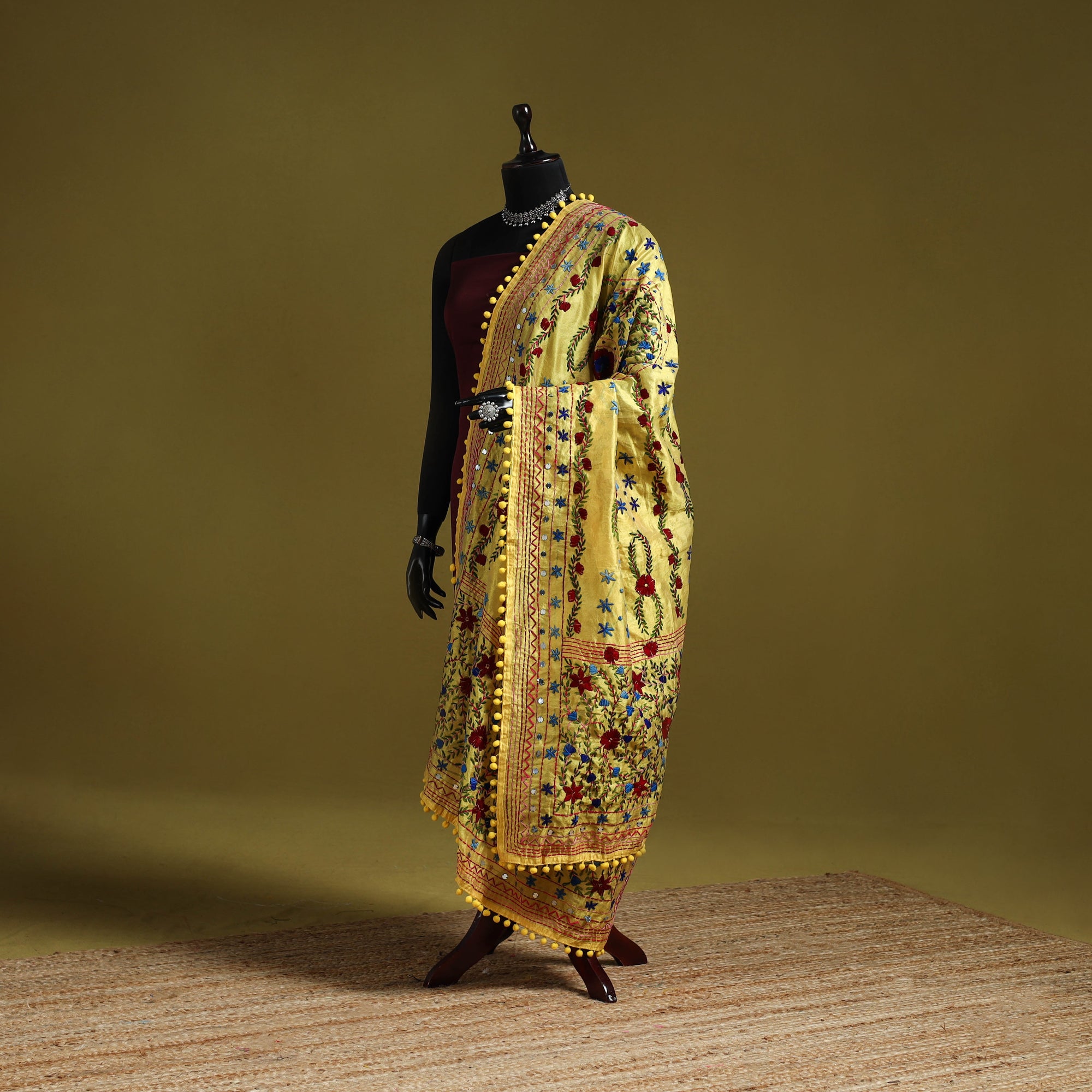 Add charm to your outfit with this yellow chapa work hand-embroidery dupatta with pom pom in chanderi silk. Featuring traditional motifs, it is created by skilled artisans from Ranihati in West Bengal. The intricate threadwork adds depth and beauty, making it perfect for festive gatherings, family functions, and cultural celebrations.