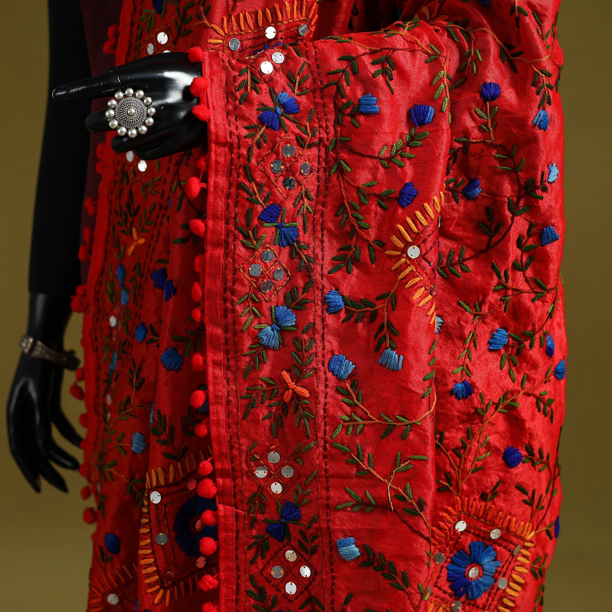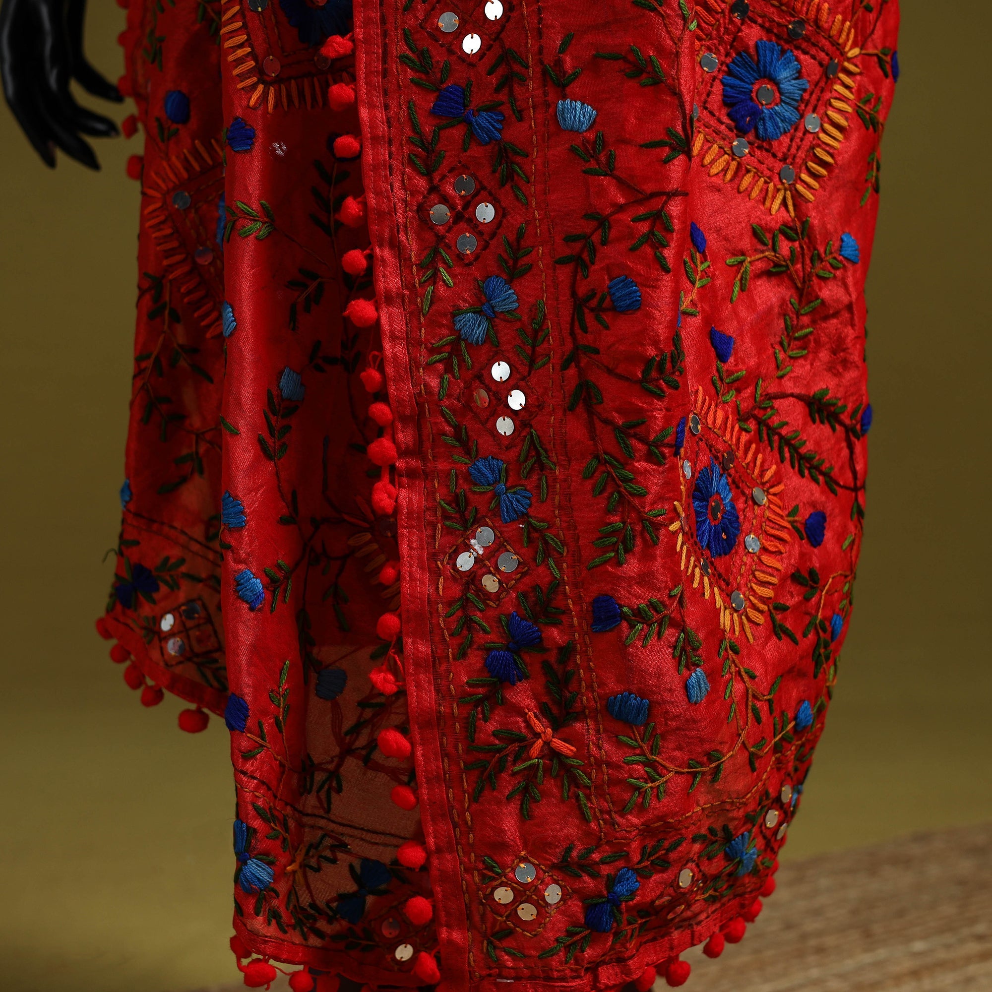 Add charm to your outfit with this red chapa work hand-embroidery dupatta with pom pom in chanderi silk. Featuring traditional motifs, it is created by skilled artisans from Ranihati in West Bengal. The intricate threadwork adds depth and beauty, making it perfect for festive gatherings, family functions, and cultural celebrations.