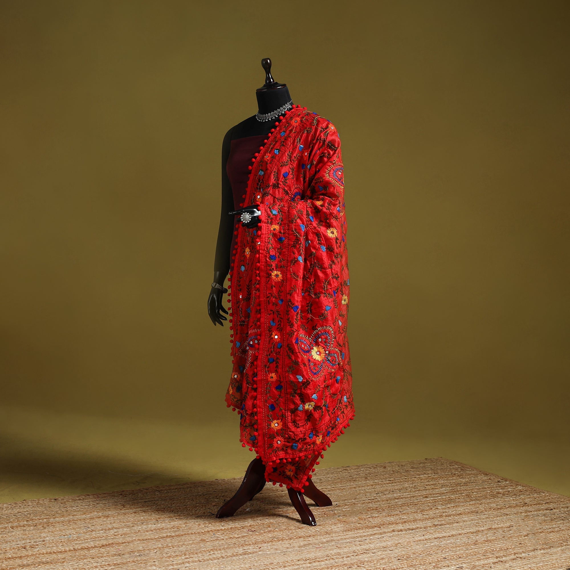 Add charm to your outfit with this red chapa work hand-embroidery dupatta with pom pom in chanderi silk. Featuring traditional motifs, it is created by skilled artisans from Ranihati in West Bengal. The intricate threadwork adds depth and beauty, making it perfect for festive gatherings, family functions, and cultural celebrations.
