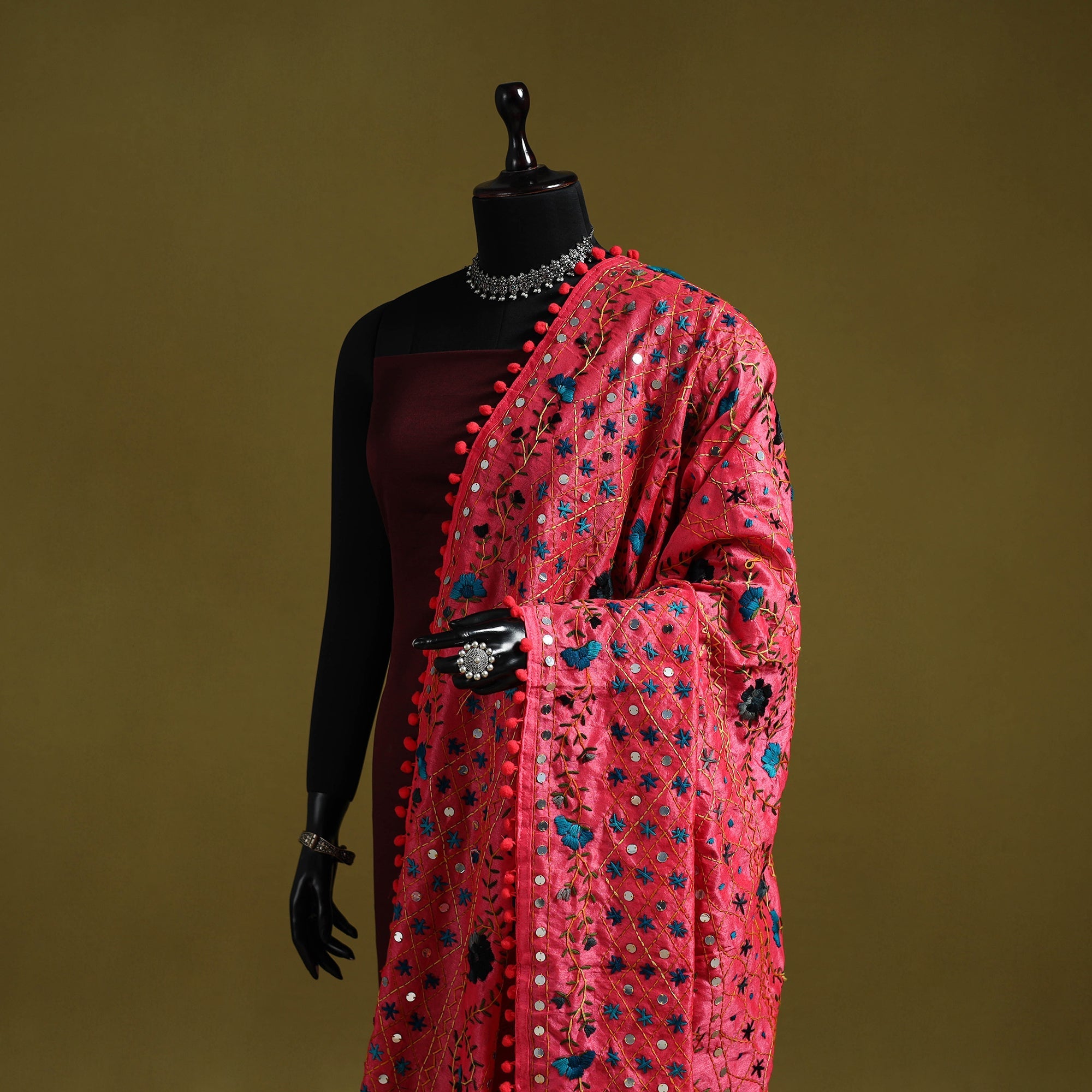 Pink - Ranihati Chapa Work Chanderi Silk Hand Embroidery Dupatta 132