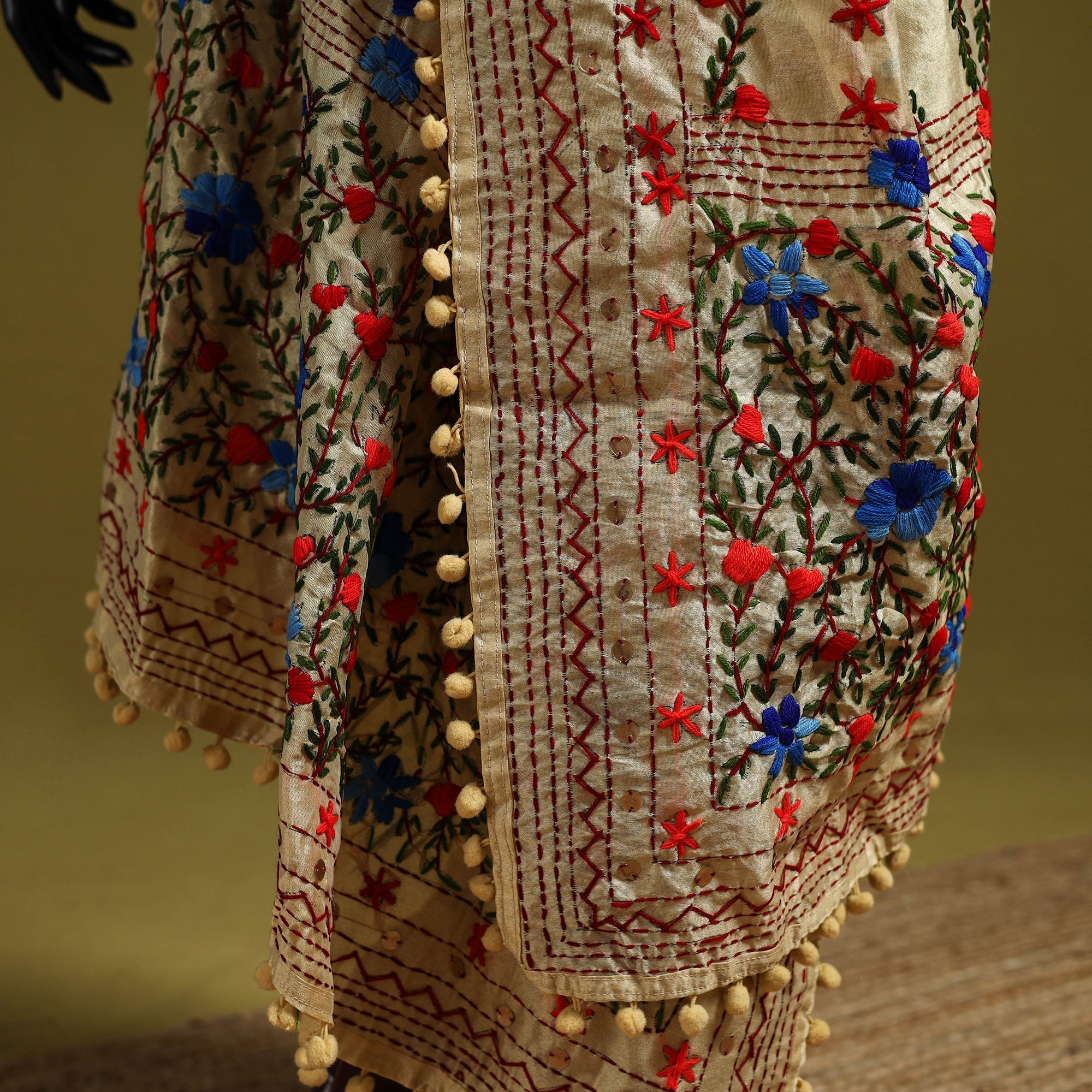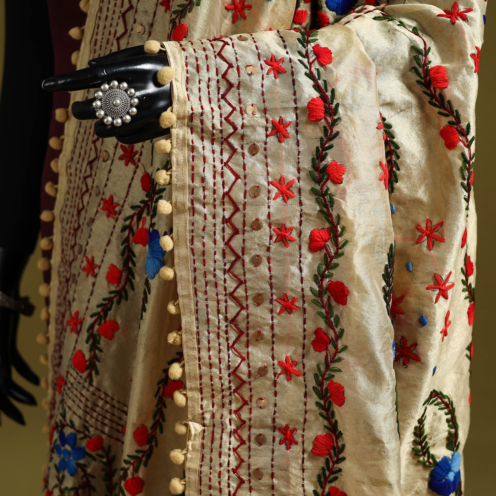 Add charm to your outfit with this beige chapa work hand-embroidery dupatta with pom pom in chanderi silk. Featuring traditional motifs, it is created by skilled artisans from Ranihati in West Bengal. The intricate threadwork adds depth and beauty, making it perfect for festive gatherings, family functions, and cultural celebrations.