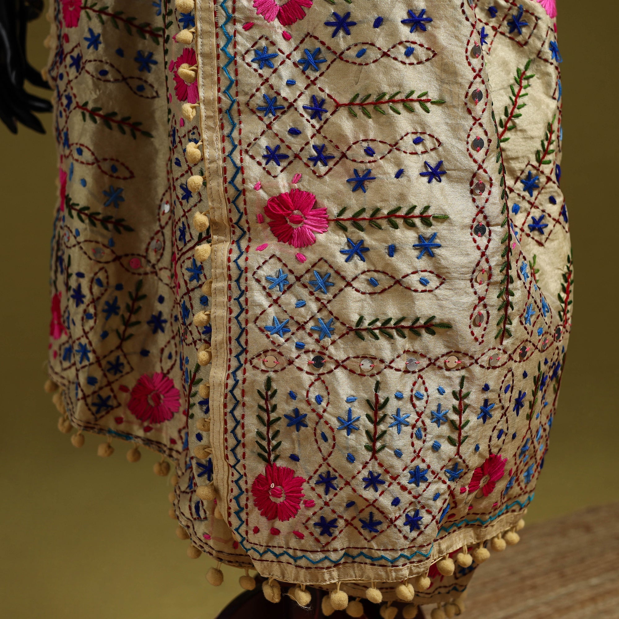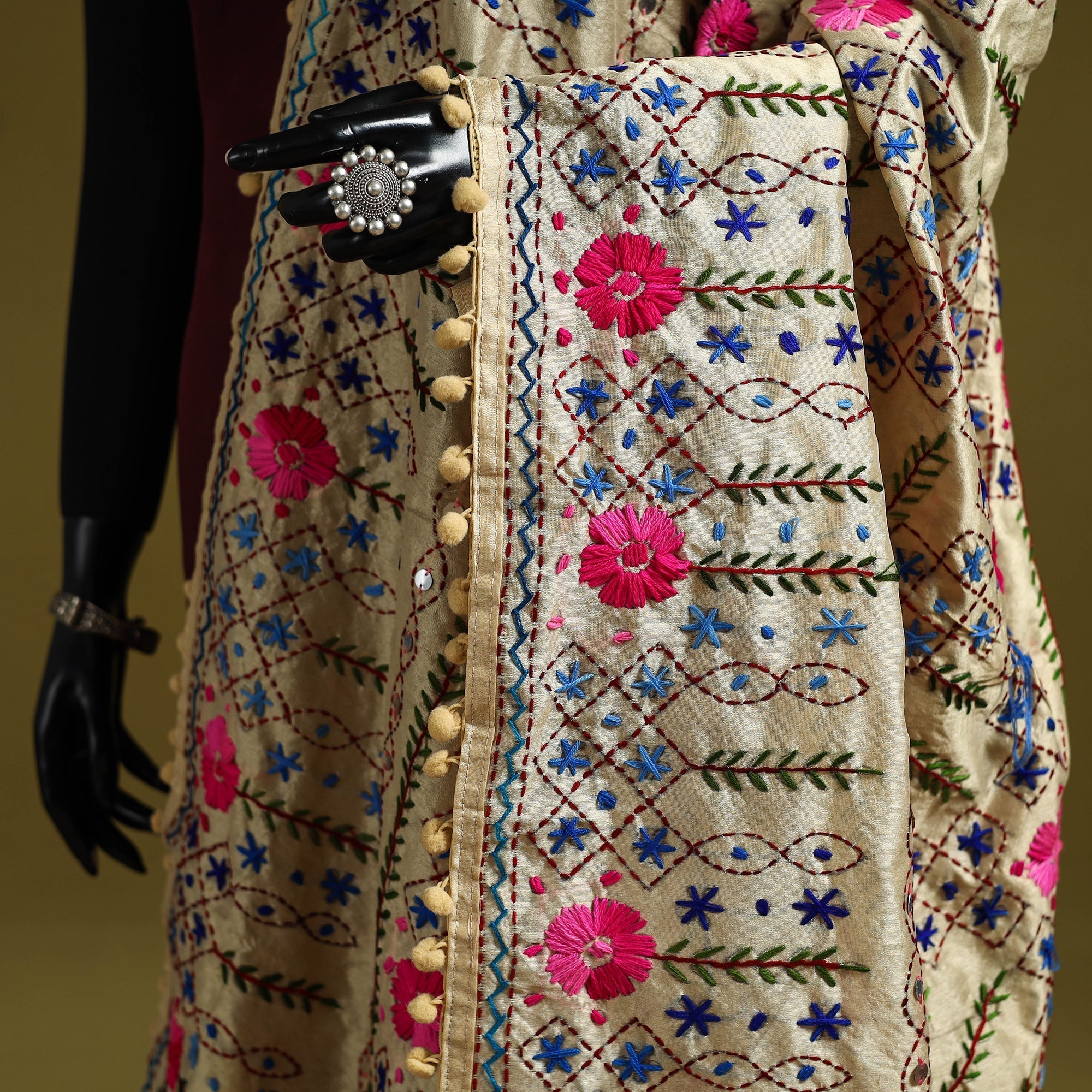 Add charm to your outfit with this beige chapa work hand-embroidery dupatta with pom pom in chanderi silk. Featuring traditional motifs, it is created by skilled artisans from Ranihati in West Bengal. The intricate threadwork adds depth and beauty, making it perfect for festive gatherings, family functions, and cultural celebrations.