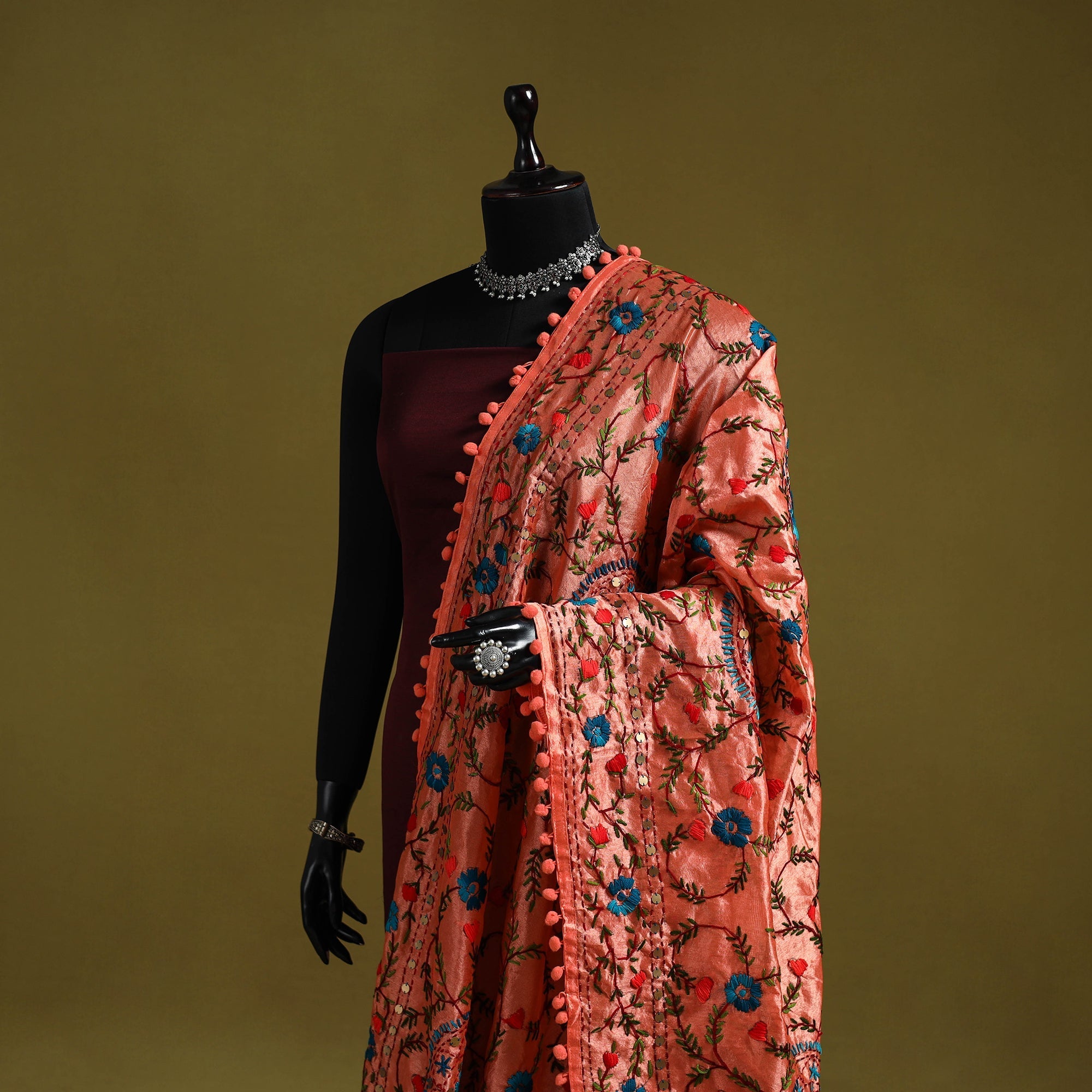 Peach - Ranihati Chapa Work Chanderi Silk Hand Embroidery Dupatta 134