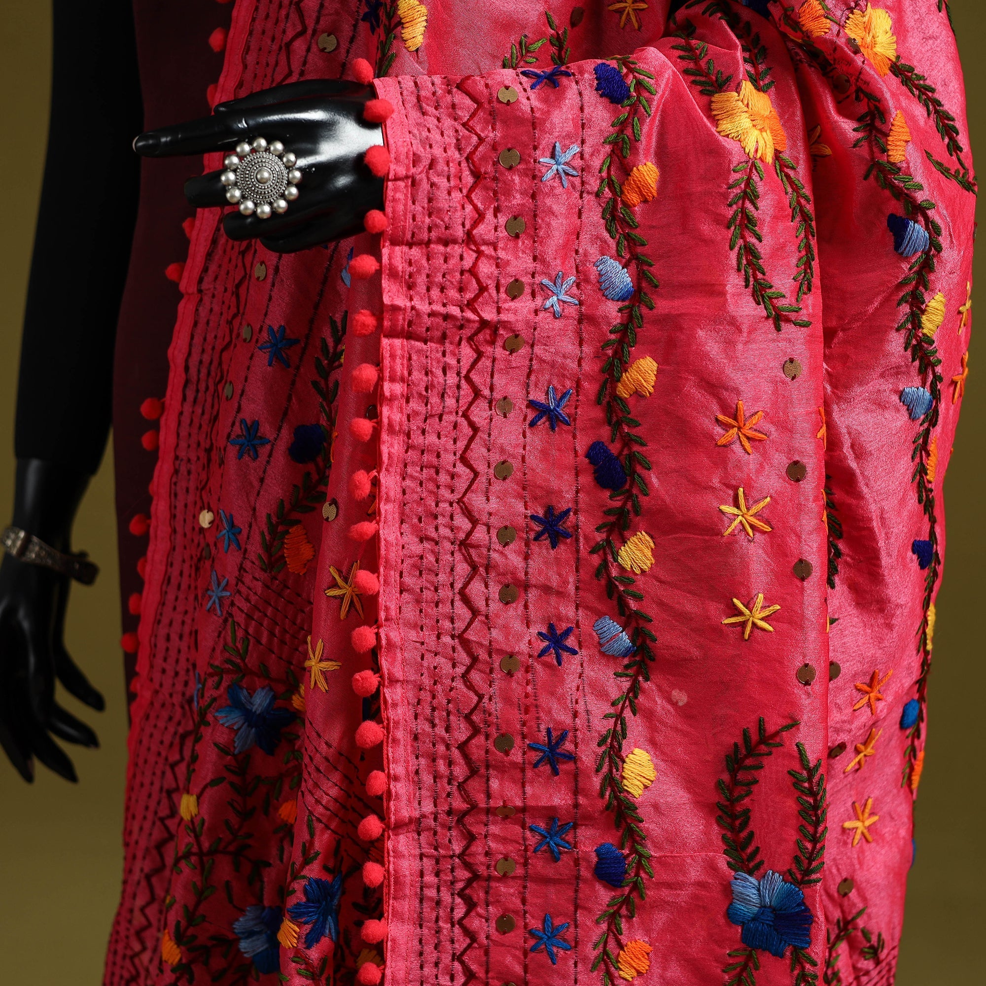 Add charm to your outfit with this pink chapa work hand-embroidery dupatta with pom pom in chanderi silk. Featuring traditional motifs, it is created by skilled artisans from Ranihati in West Bengal. The intricate threadwork adds depth and beauty, making it perfect for festive gatherings, family functions, and cultural celebrations.