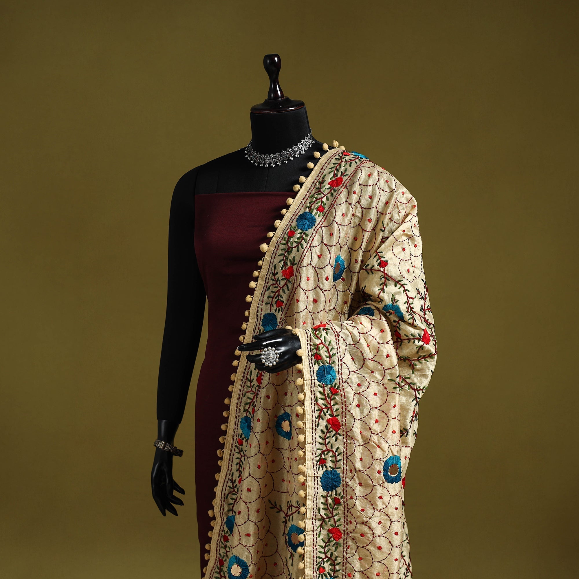 Add charm to your outfit with this beige chapa work hand-embroidery dupatta with pom pom in chanderi silk. Featuring traditional motifs, it is created by skilled artisans from Ranihati in West Bengal. The intricate threadwork adds depth and beauty, making it perfect for festive gatherings, family functions, and cultural celebrations.