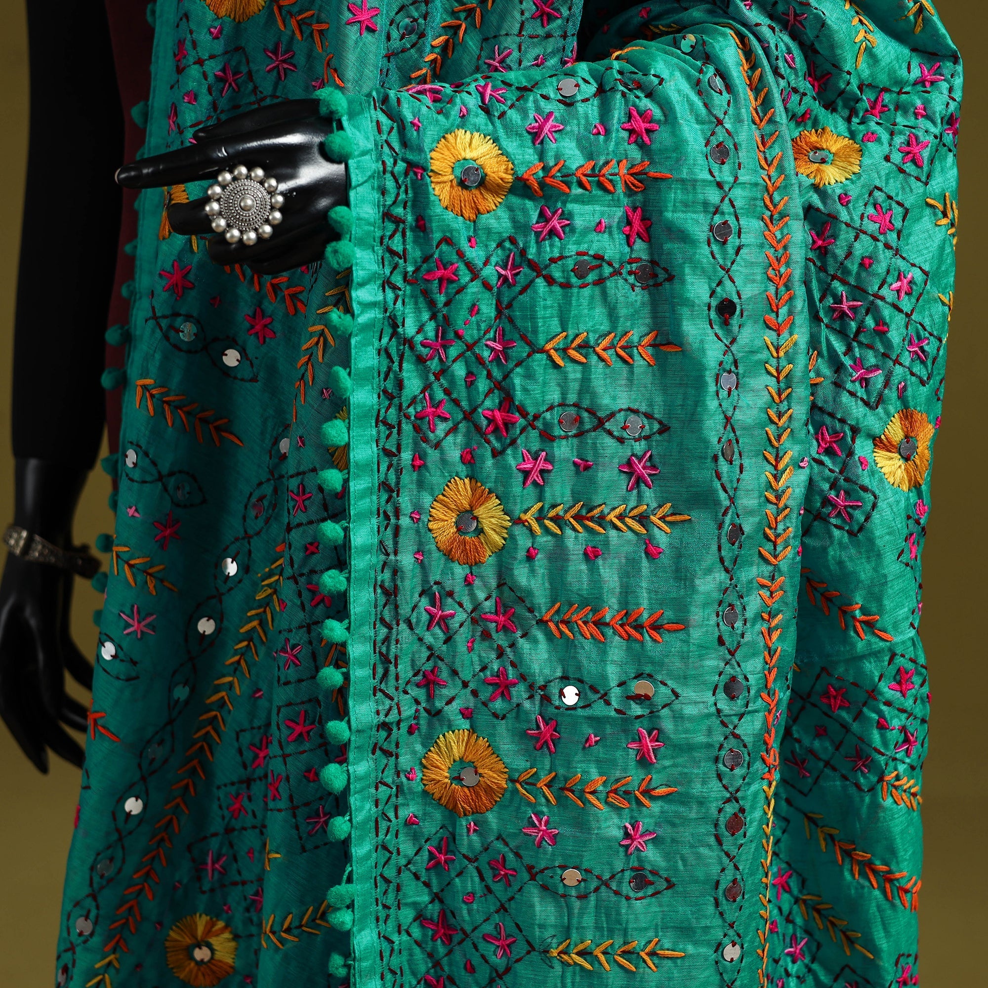 Add charm to your outfit with this green chapa work hand-embroidery dupatta with pom pom in chanderi silk. Featuring traditional motifs, it is created by skilled artisans from Ranihati in West Bengal. The intricate threadwork adds depth and beauty, making it perfect for festive gatherings, family functions, and cultural celebrations.