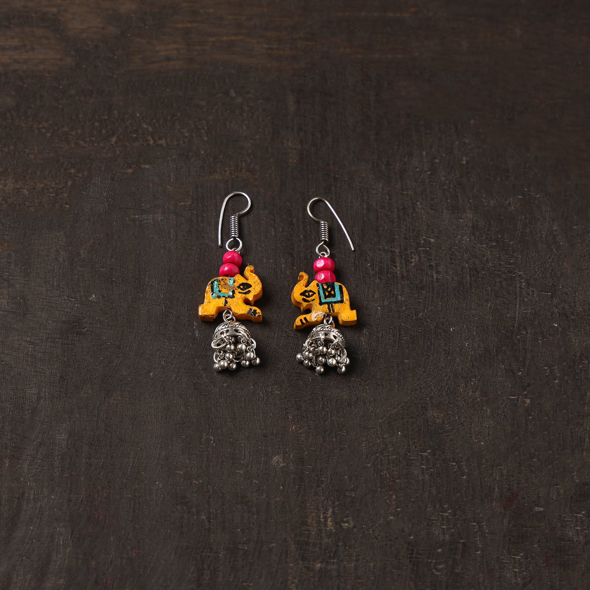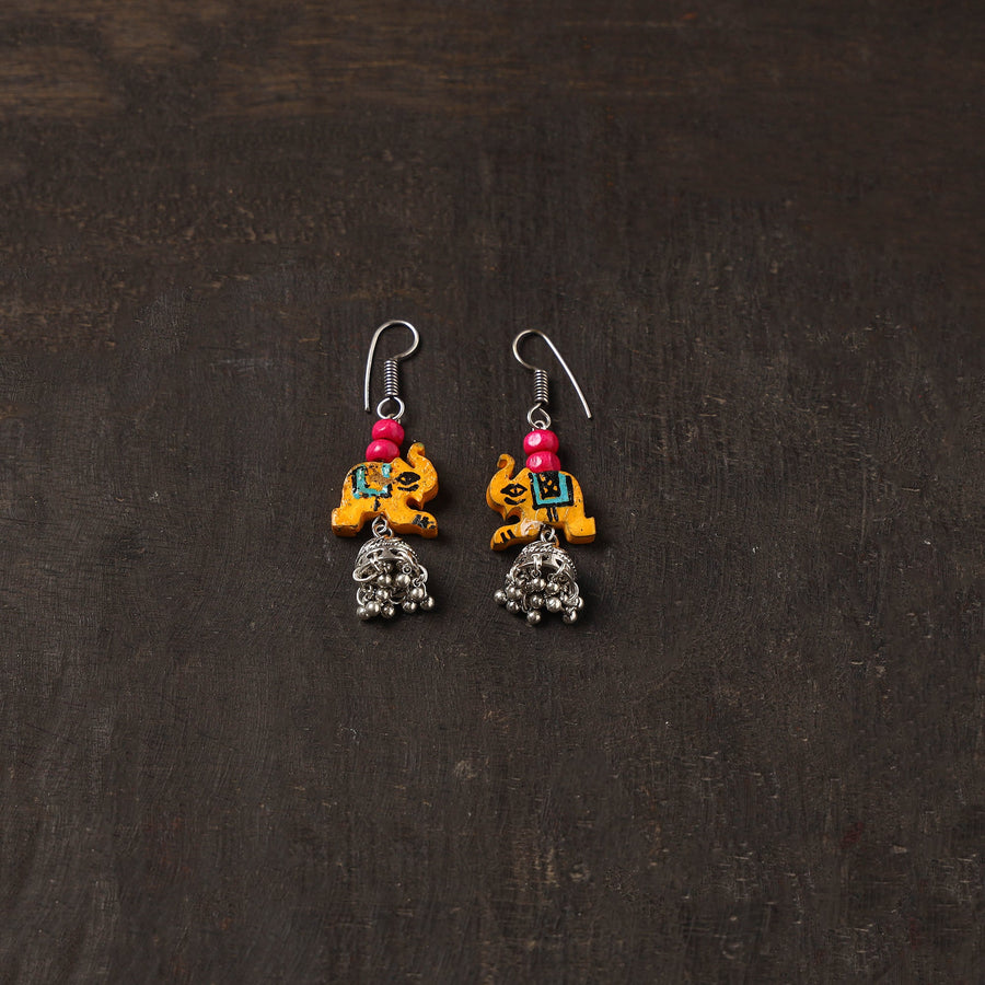 Handcrafted german silver jhumki earrings are beautifully detailed with orange wooden elephant and beads. Made by women skilled artisans, they offer a lightweight and perfect for adding a unique charm to festive and everyday looks. German silver adds durability and is known for its strong, long-lasting finish.