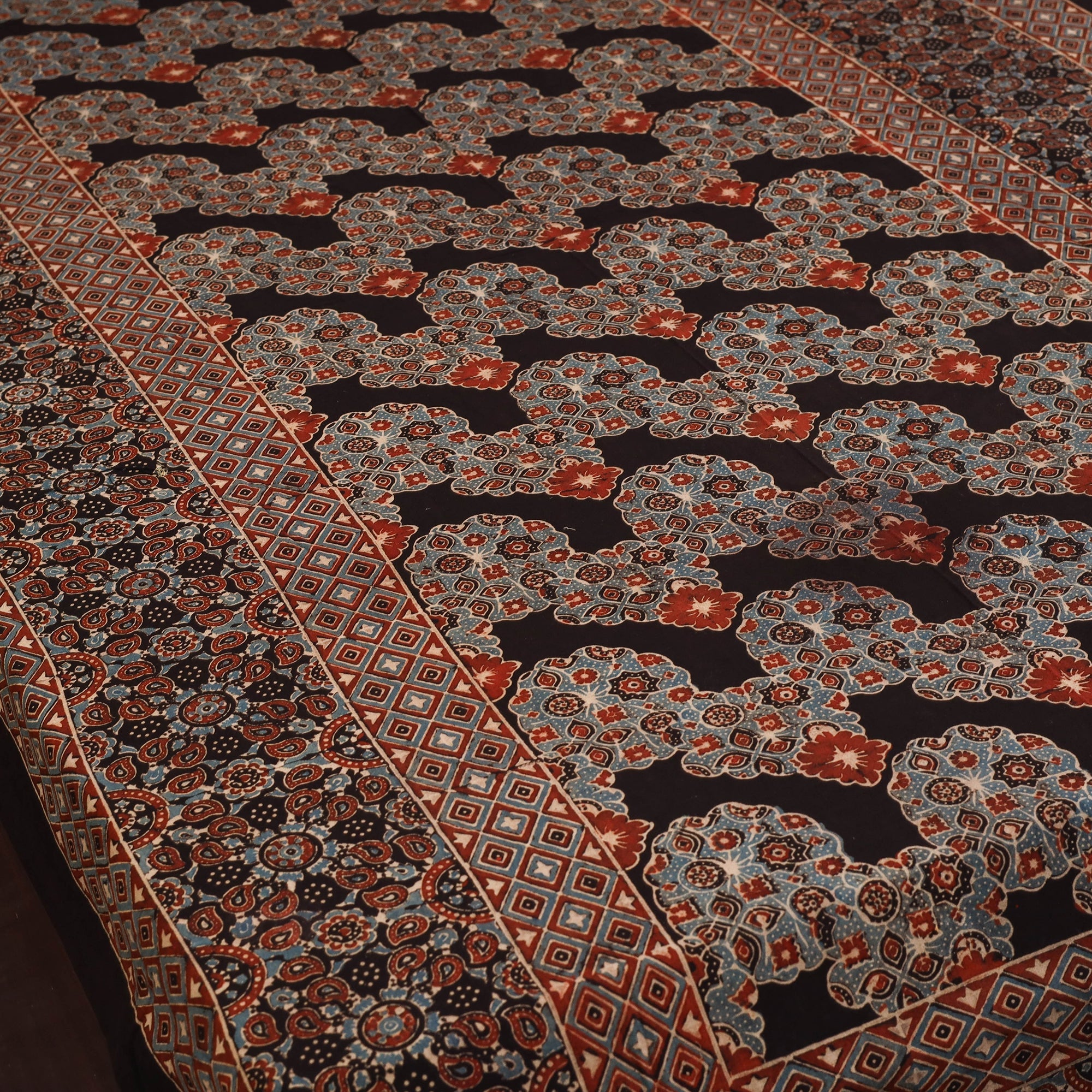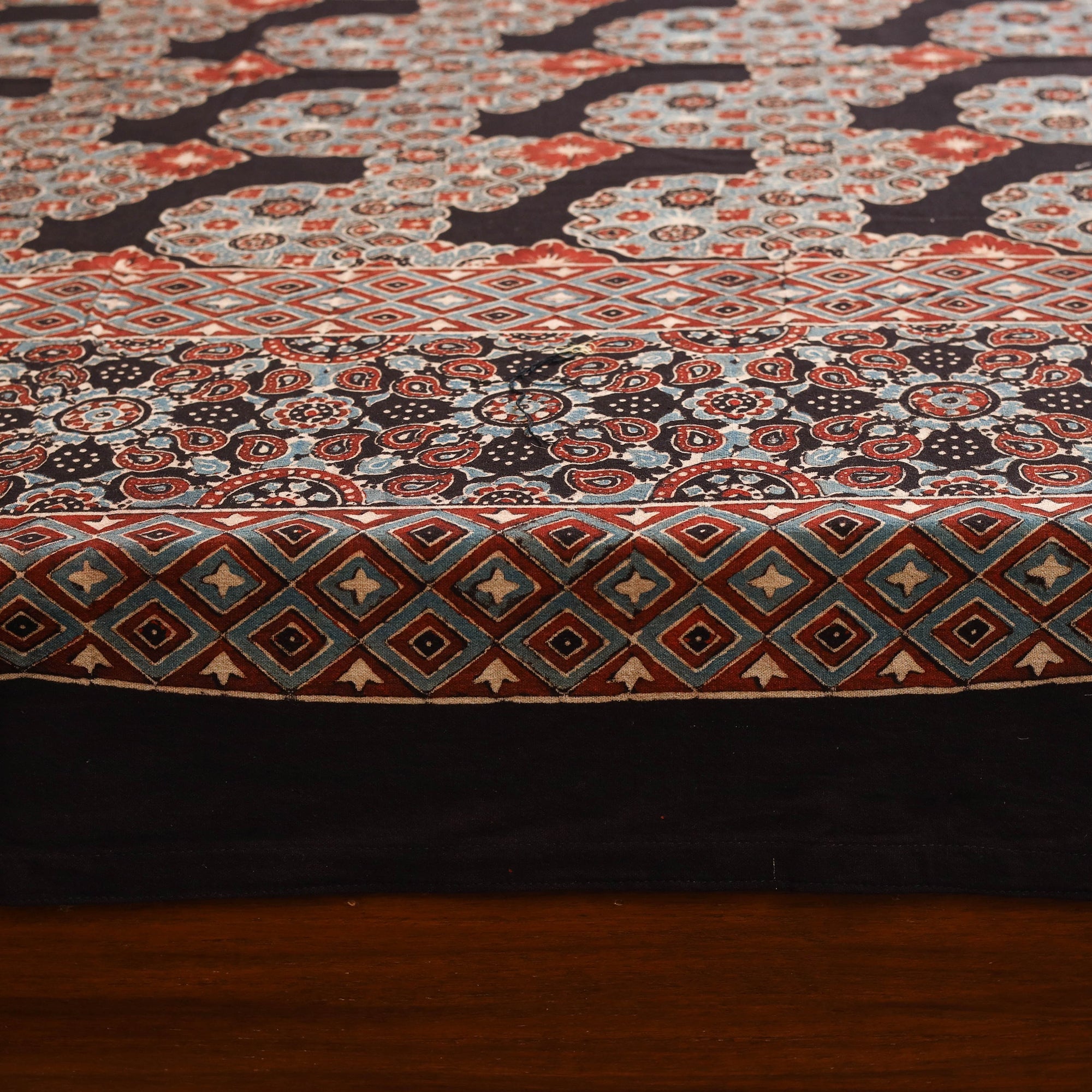 Experience the artistry of Kutch with this cotton ajrakh single bed sheet set by Jabbar Khatri. Crafted using centuries-old block printing techniques and natural dyes, it features intricate geometric patterns. Complete with matching pillow cover, this breathable and durable set is perfect for everyday use or festive occasions.