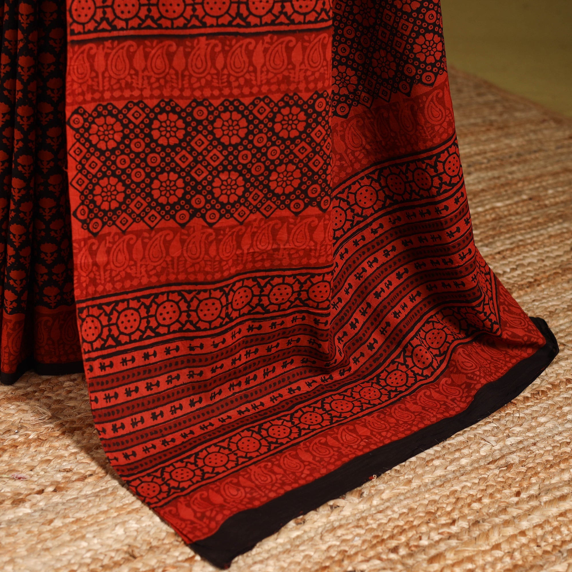 This red mulmul cotton saree features traditional bagru block printing, known for its bold and intricate patterns. Crafted with hand-carved wooden blocks and dyed using natural colours, the saree is soft, breathable, and perfect for all-day wear. Whether for everyday elegance or a special occasion, it offers a perfect blend of comfort and timeless style.