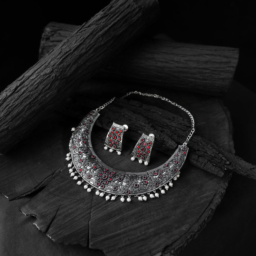 Oxidised handcrafted red necklace set features intricate detailing using varied materials like metal, stones, pearls and artistic motifs. Perfect for festive occasions, weddings, office wear or casual styling it pairs beautifully with sarees, kurtas, or contemporary outfits. Complete with matching earrings, this set makes for a thoughtful gift for mother, sister, wife, or girlfriend adding beauty and grace to every special moment.
