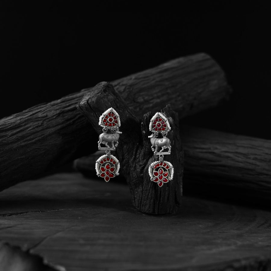Oxidised handcrafted red earrings made with a blend of metal, stones and fine detailing. Perfect for festive occasions, weddings, casual outings, office wear, or vacations. Their elegant black and silver tones pair beautifully with everything from casual jeans and flowy dresses to chic office ensembles. A meaningful gift for mother, sister, wife, or girlfriend adding a beautiful touch of tradition to every moment.