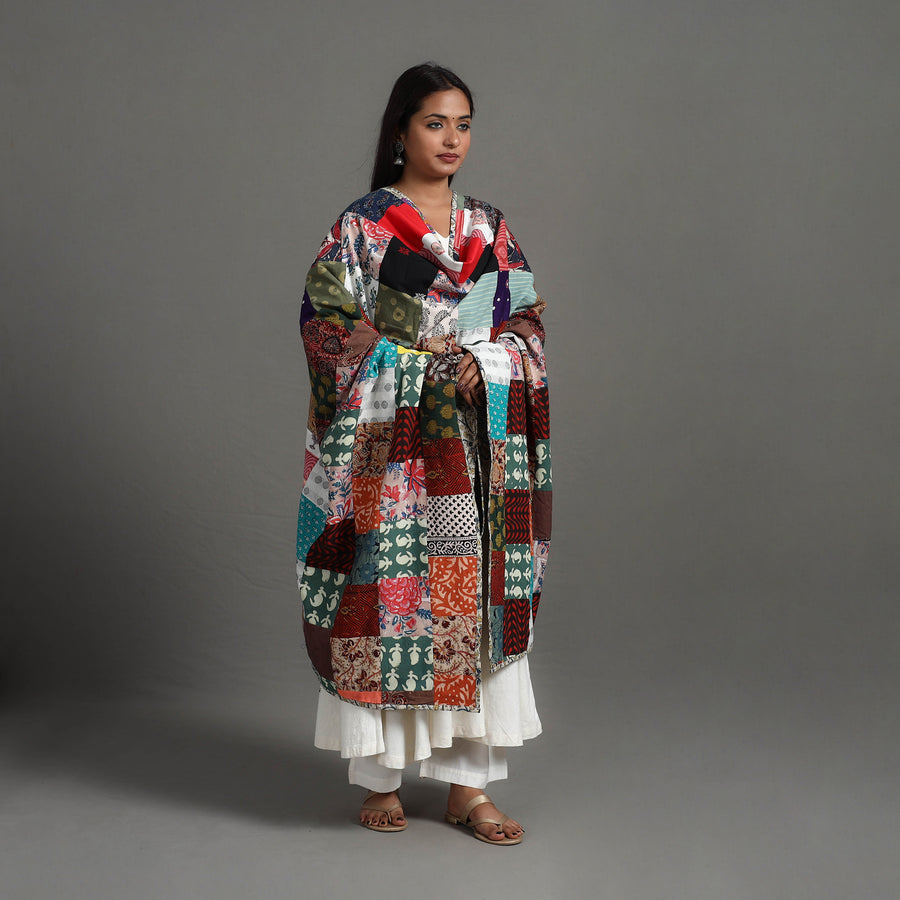 Add versatility to your wardrobe with this vibrant multicolor reversible block print cotton patchwork dupatta. One side features intricate kalamkari block prints, while the other showcases beautifully stitched patchwork panels. Designed for dual-sided use, it pairs effortlessly with casual and festive outfits. Lightweight and stylish, this dupatta is perfect for adding a unique touch to your look, offering two distinct styles in one elegant piece.
