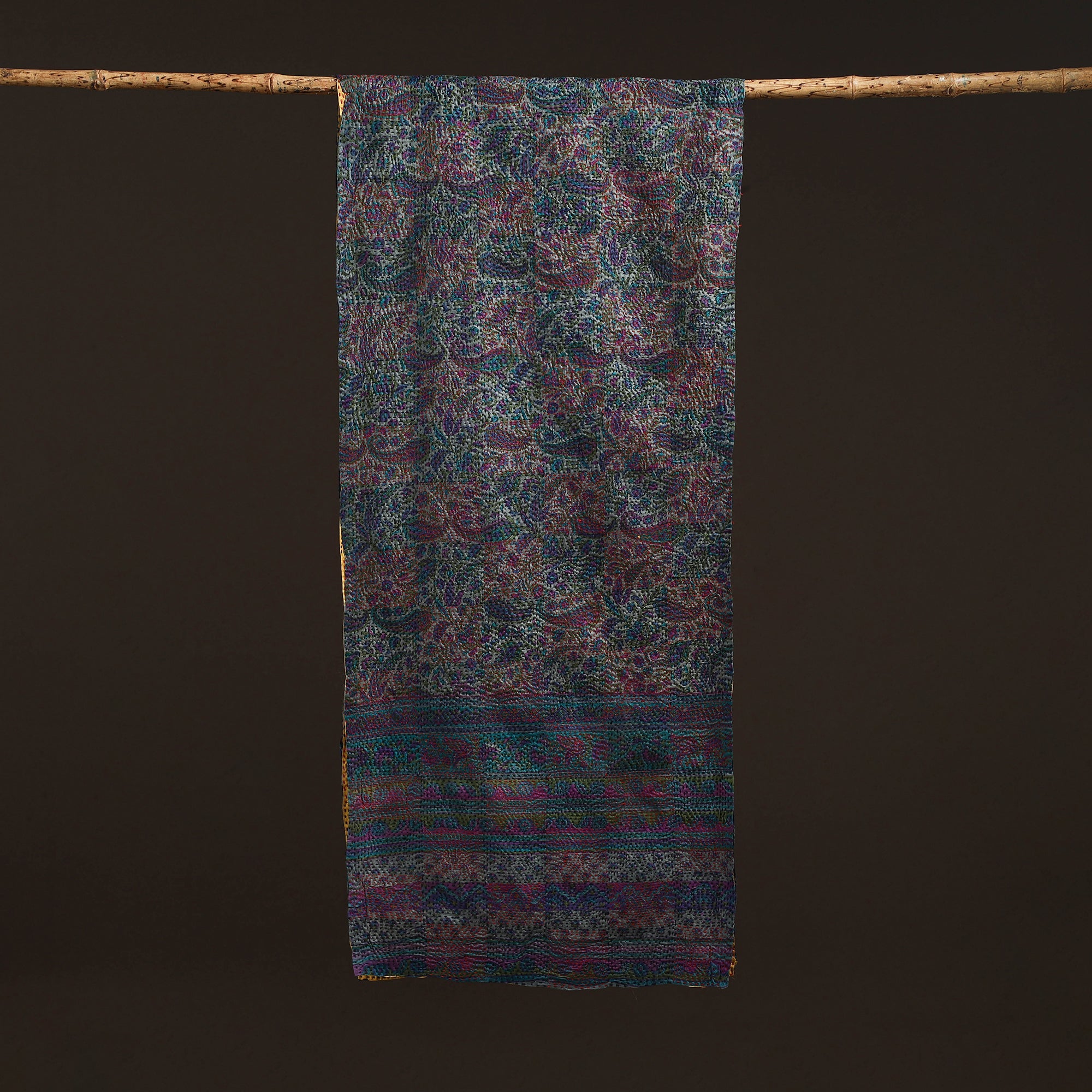 Yellow kantha handwork art silk reversible stole crafted by the women of West Bengal with sustainable stitching and weaving methods that can only be found in the rural regions of Bengal. Perfect for casual wear, this stole pairs well with a wide range of outfits.