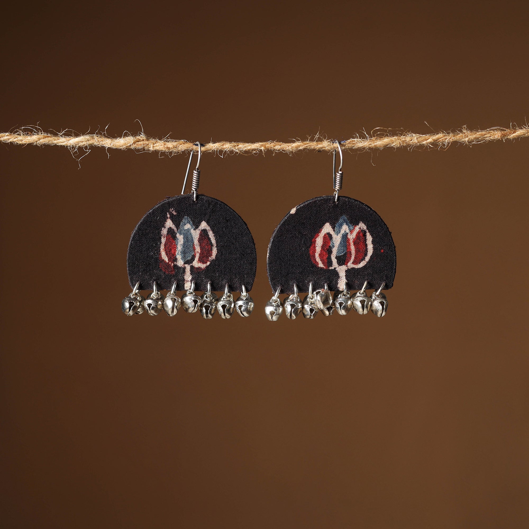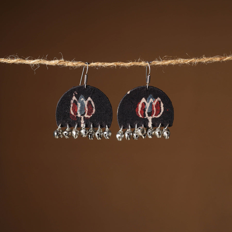 Elevate your style with our black handcrafted earrings. Intricately designed with fabric and ghungroo work, these earrings exude sophistication. Elegant and refined, they effortlessly enhance any outfit with a harmonious blend of tradition and contemporary charm.