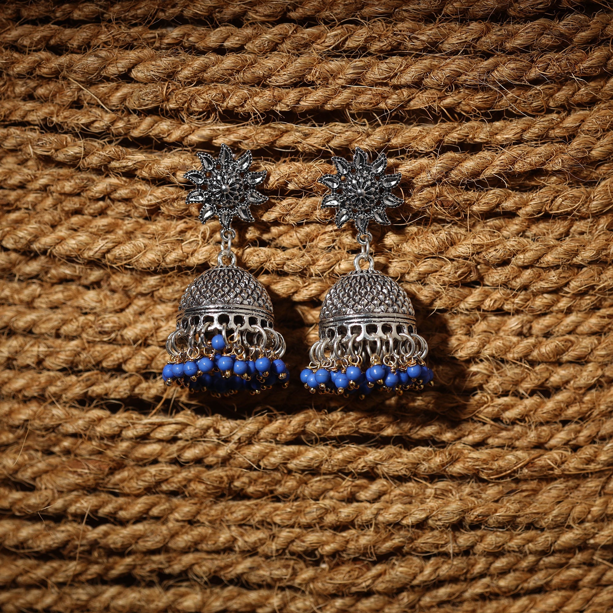 Grey handcrafted gs beaded jhumki earrings. Crafted from oxidised german silver adorned with intricate bead work. Perfect for casual outings or festive celebrations they make a versatile addition to any jewelry collection.