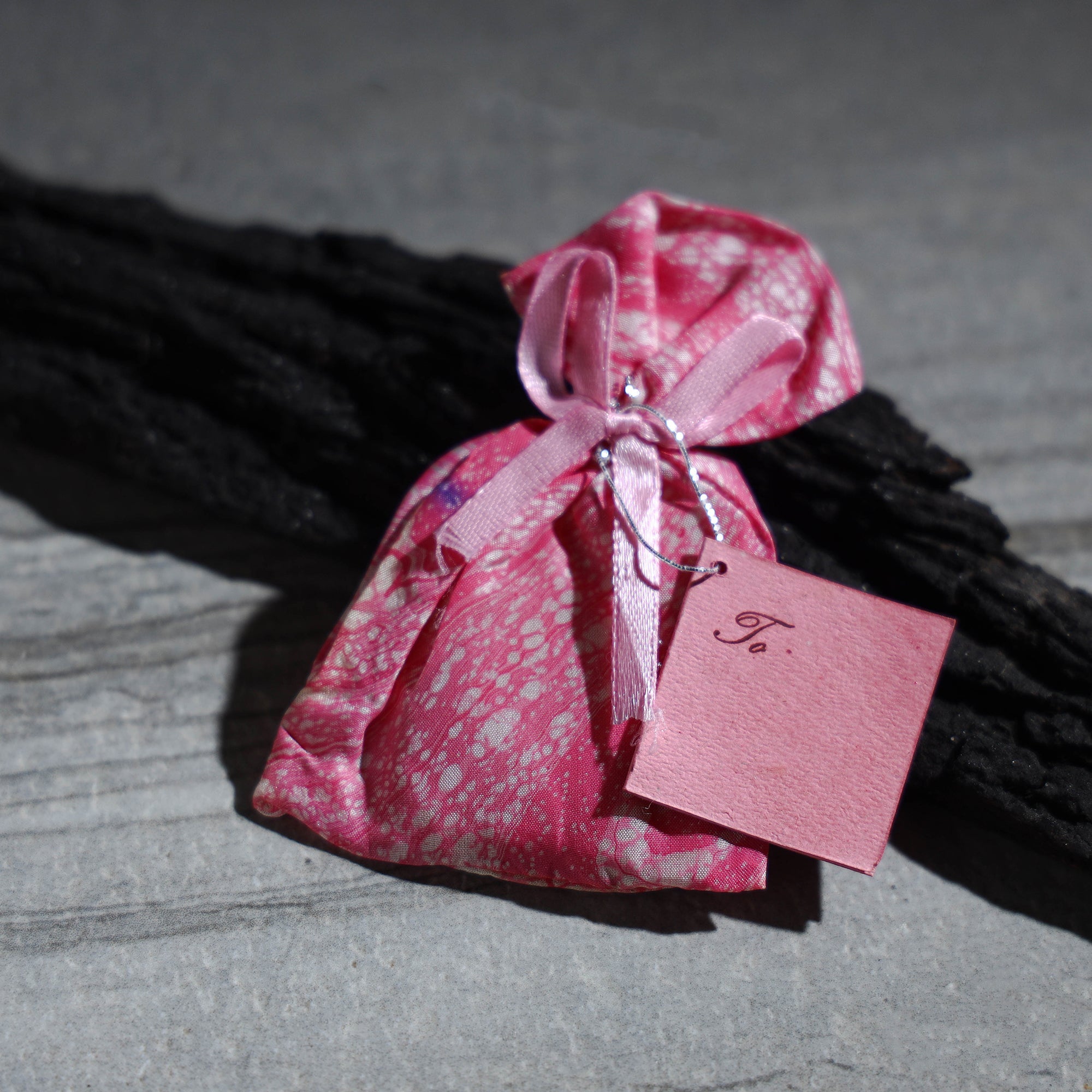 Perfumed sachet is made using fragrant herbs and essential oils, wrapped in 100% hand-marbled silk fabric. It can be used as a freshener and deodoriser without untying the ribbon.