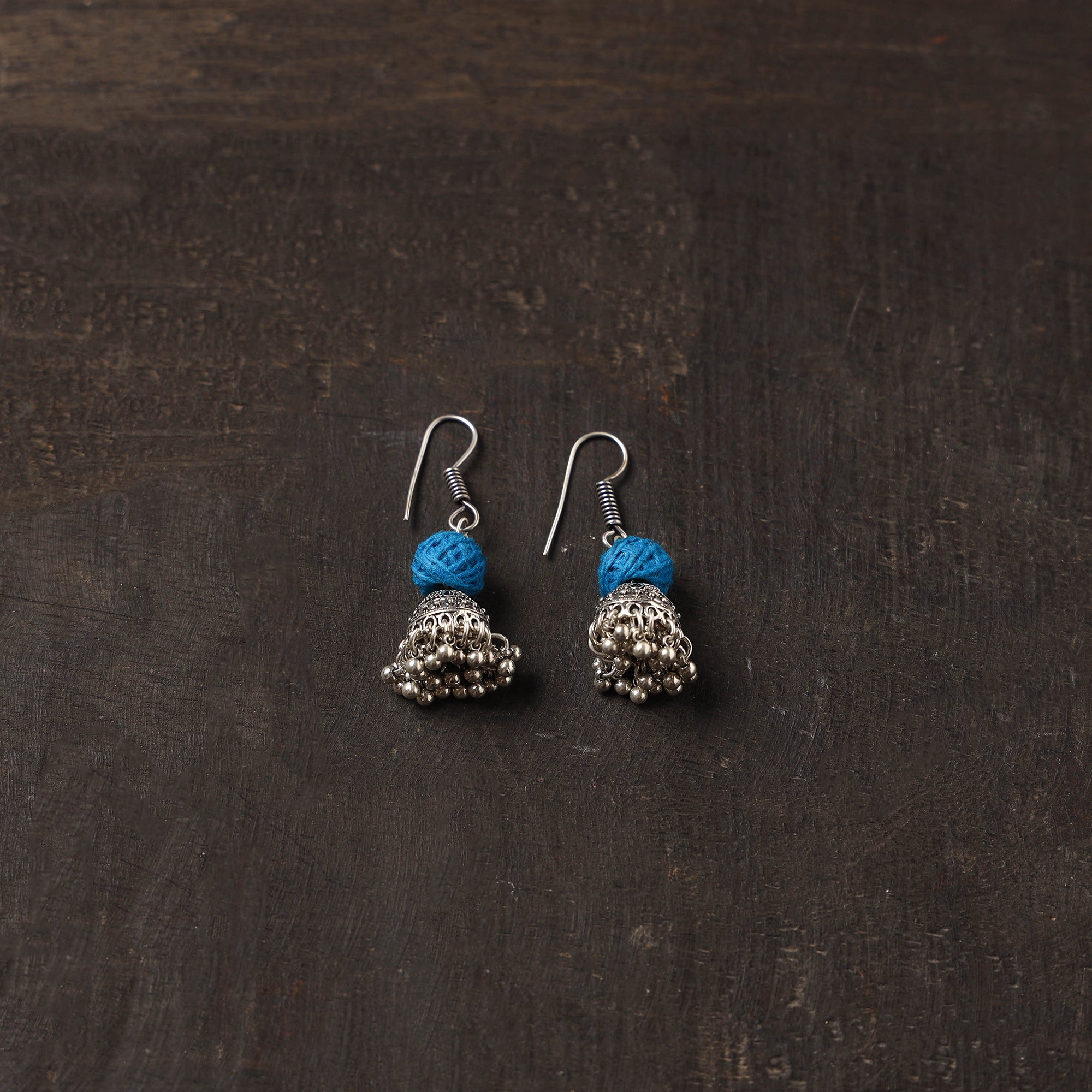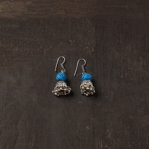 Handcrafted german silver jhumki earrings are beautifully detailed with blue thread beads. Made by iskilled artisans, they offer a lightweight, and perfect for adding a unique charm to festive and everyday looks. German silver adds durability and is known for its strong, long-lasting finish.
