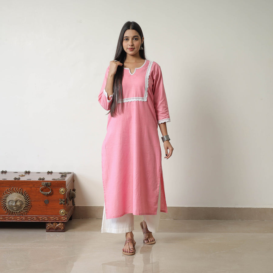 Look effortlessly chic in this pink linen cotton plain kurta with lace work, designed for comfort and style. Made from a blend of linen and cotton, this kurta ensures all-day comfort. Featuring a side pocket, this kurta is as functional as it is stylish. Perfect for daily wear and festive gatherings.