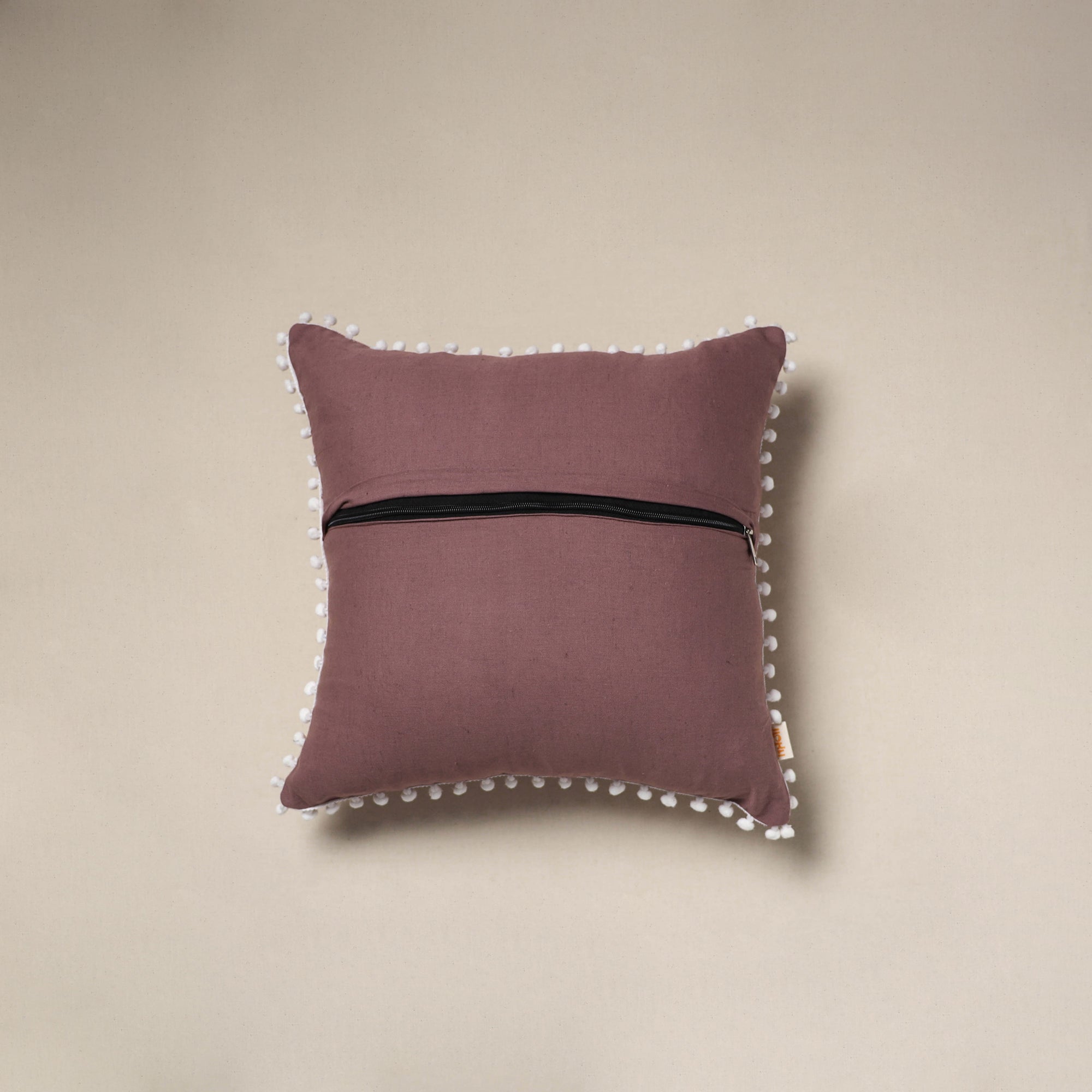 This pink running stitch plain cotton cushion cover is made from soft cotton and designed with neat stitching and pom-poms around the edges. Its simple yet elegant look makes it a perfect choice for any room. Place it on your sofa, chair, or bed to add a subtle touch of style and comfort to your space.