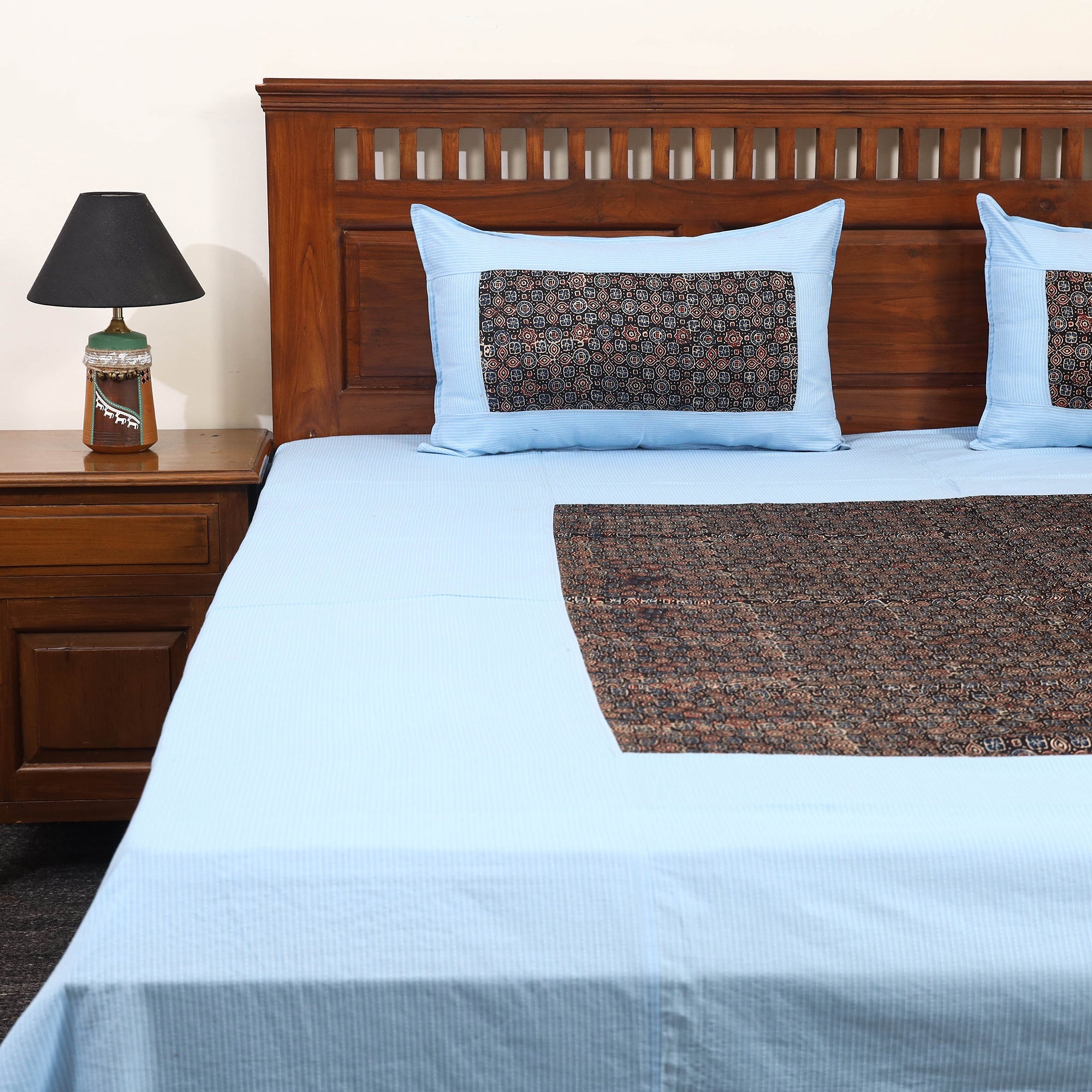 This blue running stitch cotton bedsheet set beautifully blends with ajrakh block-printed modal silk patches, showcasing traditional artistry with a contemporary flair. Crafted from breathable cotton, it offers lasting comfort and durability. The intricate detailing adds handcrafted charm to your living space. The set includes one double bedsheet and two matching pillow covers perfect for elevating your home décor with a touch of cultural elegance.