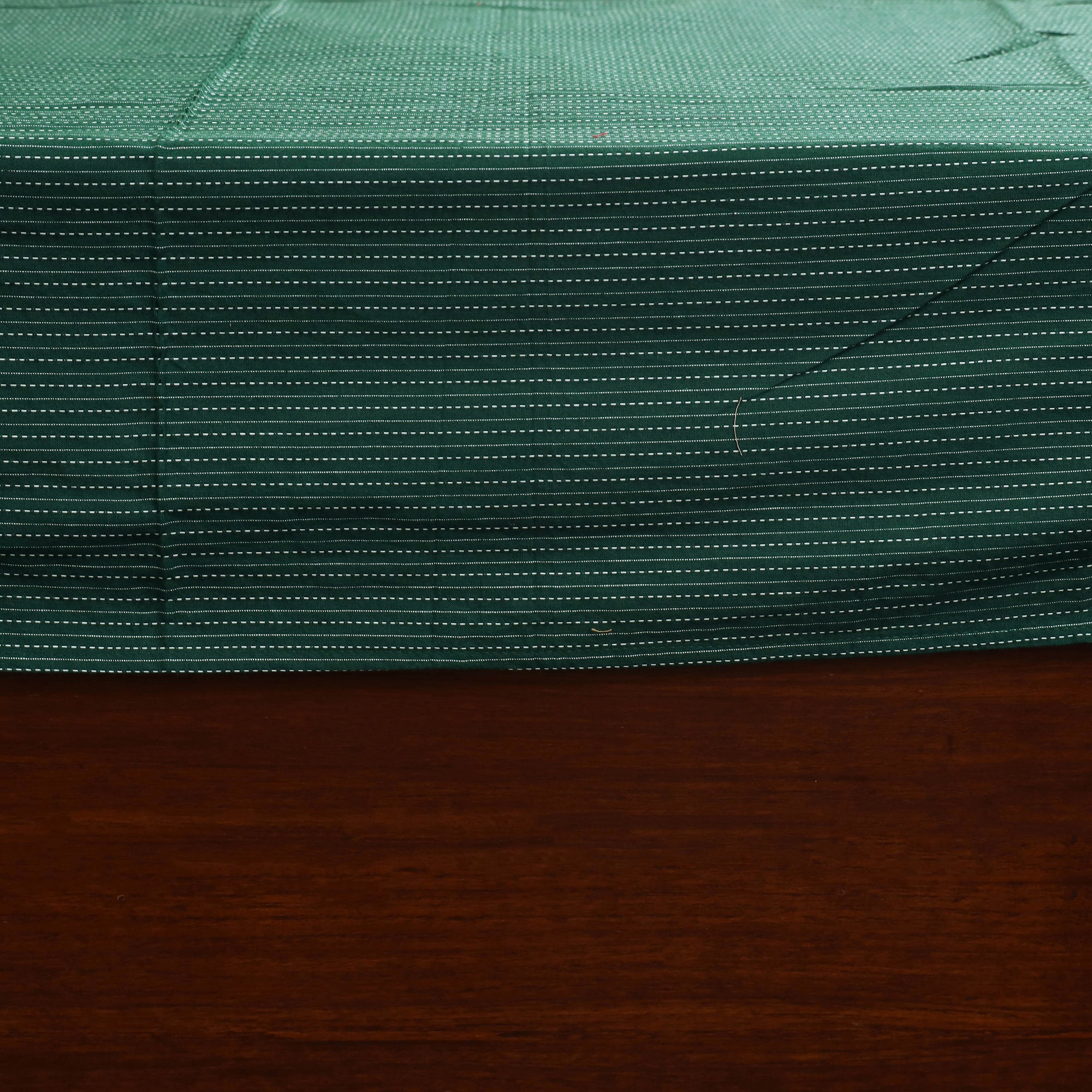 This green running stitch cotton bedsheet set beautifully blends with ajrakh block-printed modal silk patches, showcasing traditional artistry with a contemporary flair. Crafted from breathable cotton, it offers lasting comfort and durability. The intricate detailing adds handcrafted charm to your living space. The set includes one double bedsheet and two matching pillow covers perfect for elevating your home décor with a touch of cultural elegance.