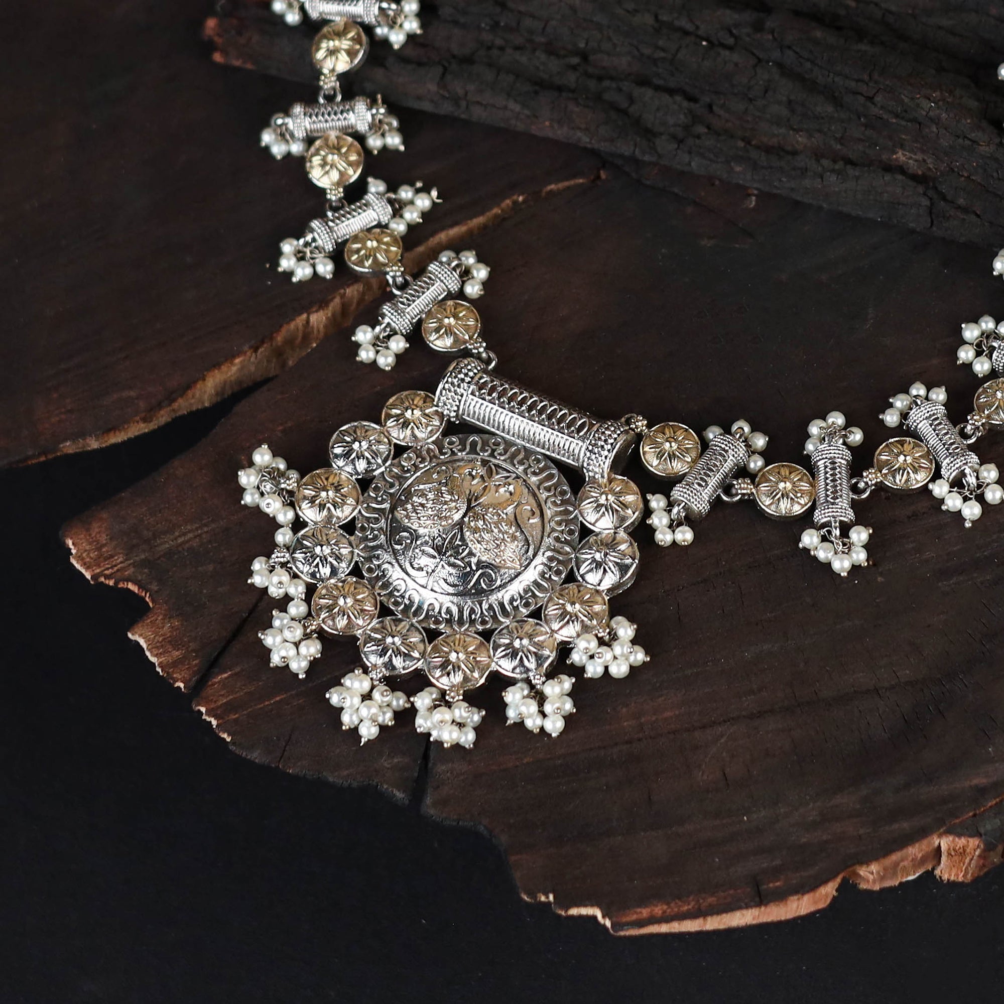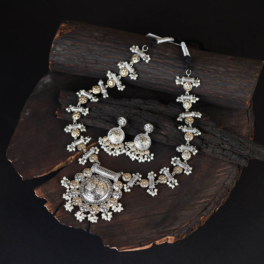 This white german silver-plated handcrafted necklace set features a blend of oxidised metal, tiny pearls, and fine detailing. Known for its durability and subtle sheen, German silver lends an elegant charm to the set. Paired with matching earrings, its silver tones beautifully complement both traditional Indian ensembles and contemporary western wear. A thoughtful gift for your loved ones, it brings a graceful touch of tradition to every moment.