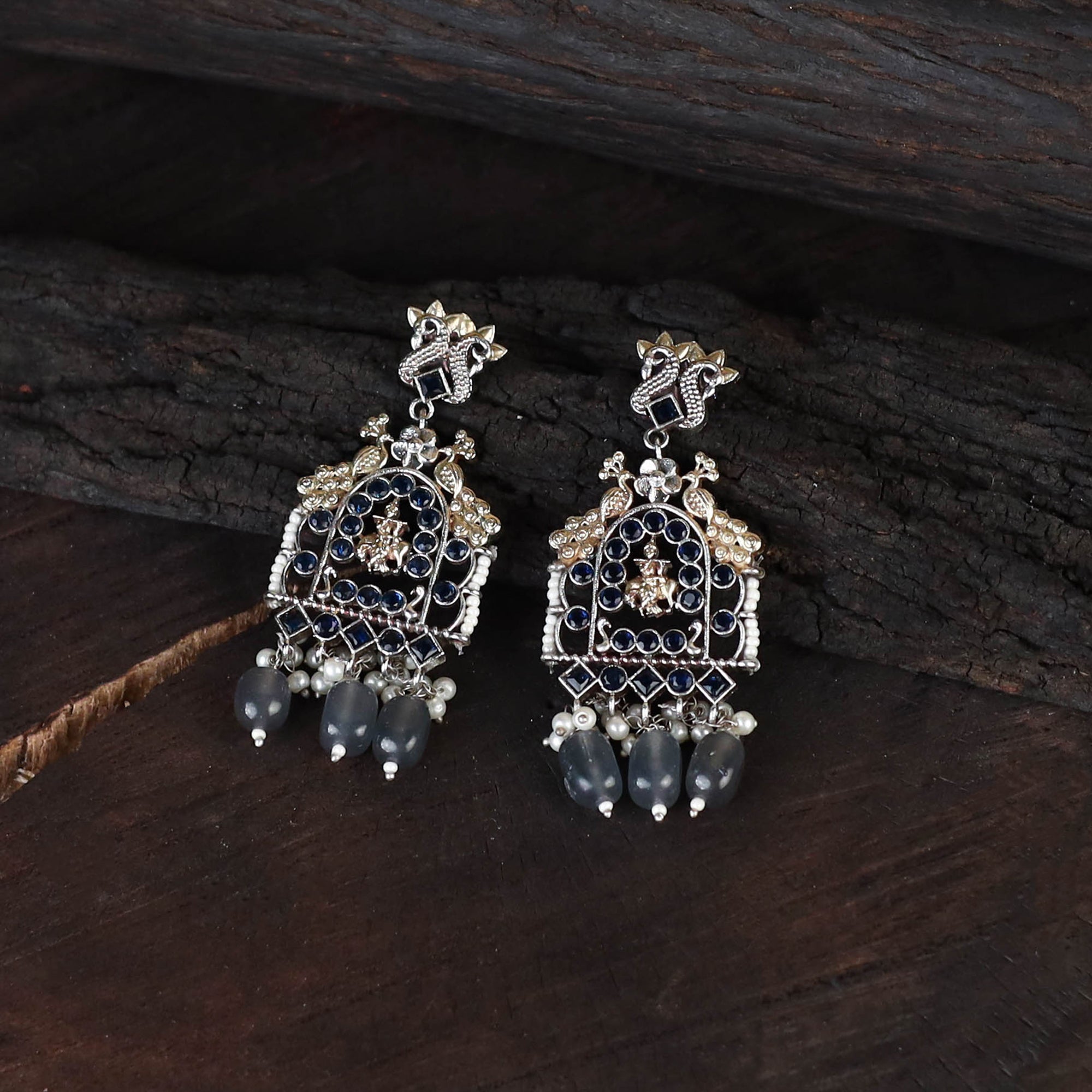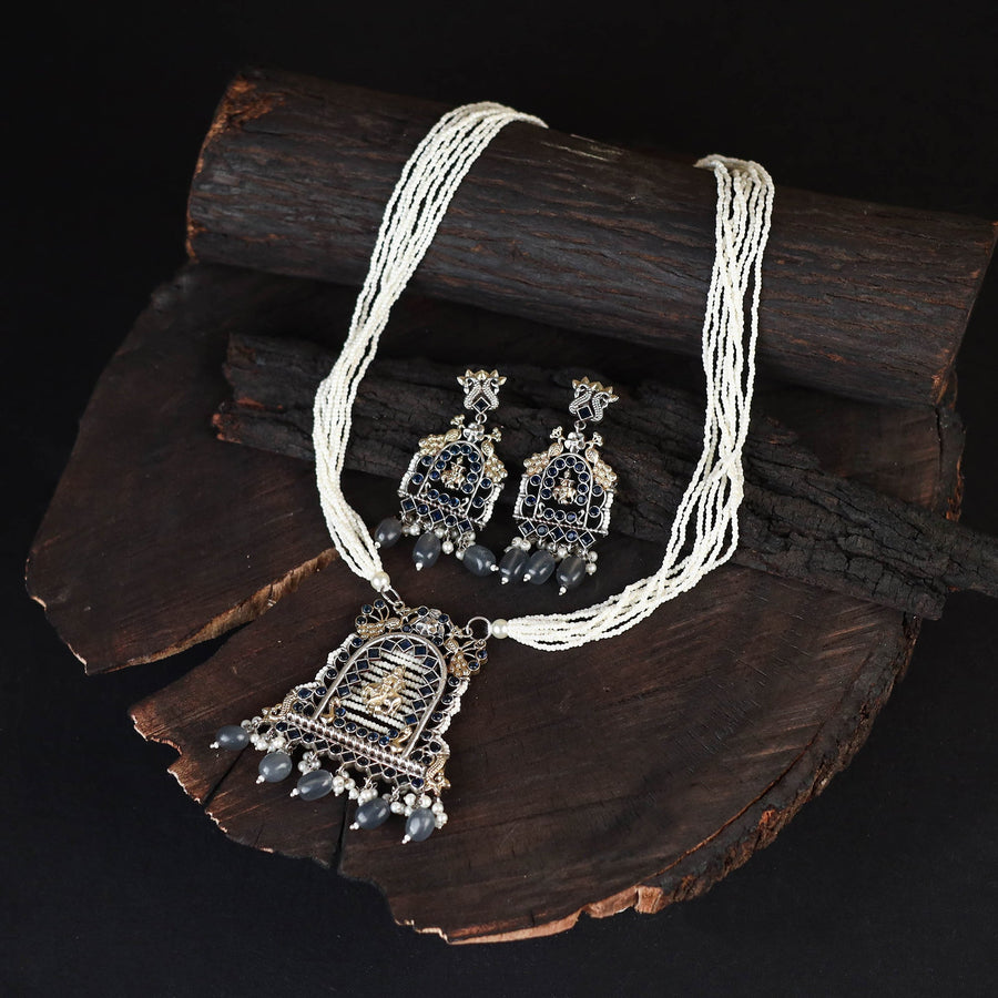 This white german silver-plated handcrafted necklace set features a blend of oxidised metal, tiny pearls, stones, and intricate detailing. Known for its durability and subtle sheen, German silver adds a refined charm to the set. Paired with matching earrings, its silvery hues beautifully complement both traditional Indian ensembles and contemporary Western wear. A thoughtful gift for your loved ones, it brings a graceful touch of tradition to every moment.