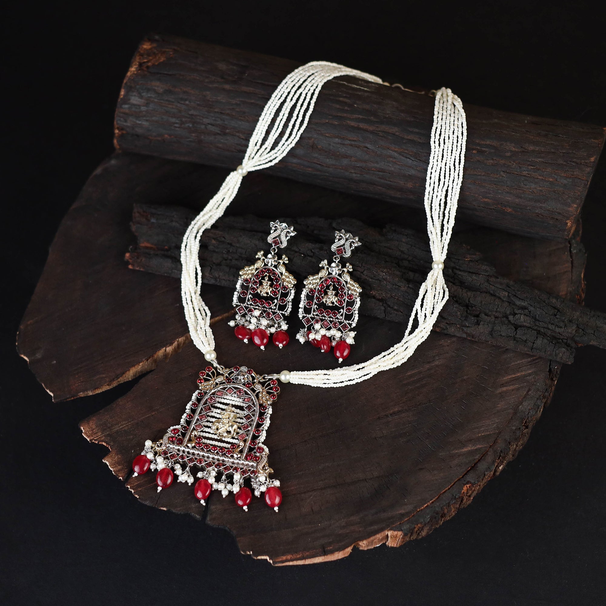 This white german silver-plated handcrafted necklace set features a blend of oxidised metal, tiny pearls, stones, and intricate detailing. Known for its durability and subtle sheen, German silver adds a refined charm to the set. Paired with matching earrings, its silvery hues beautifully complement both traditional Indian ensembles and contemporary Western wear. A thoughtful gift for your loved ones, it brings a graceful touch of tradition to every moment.