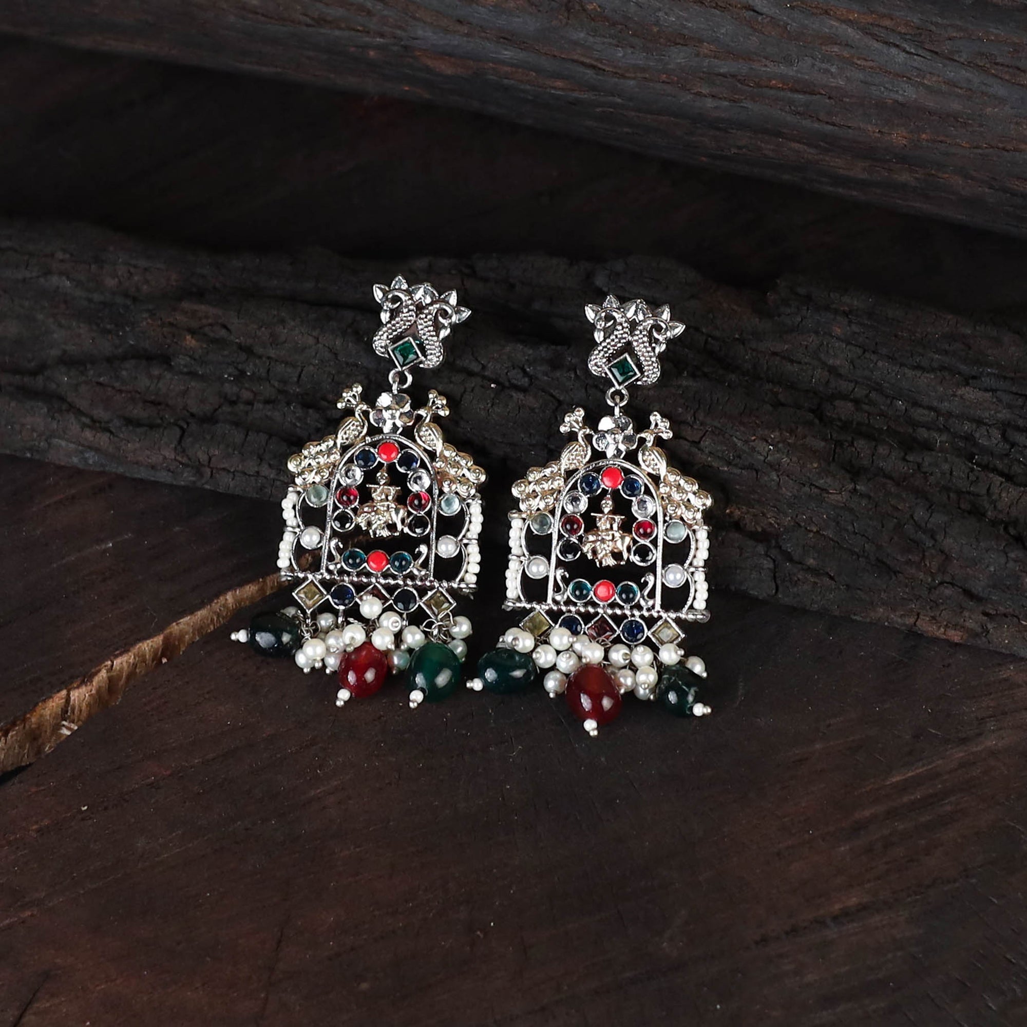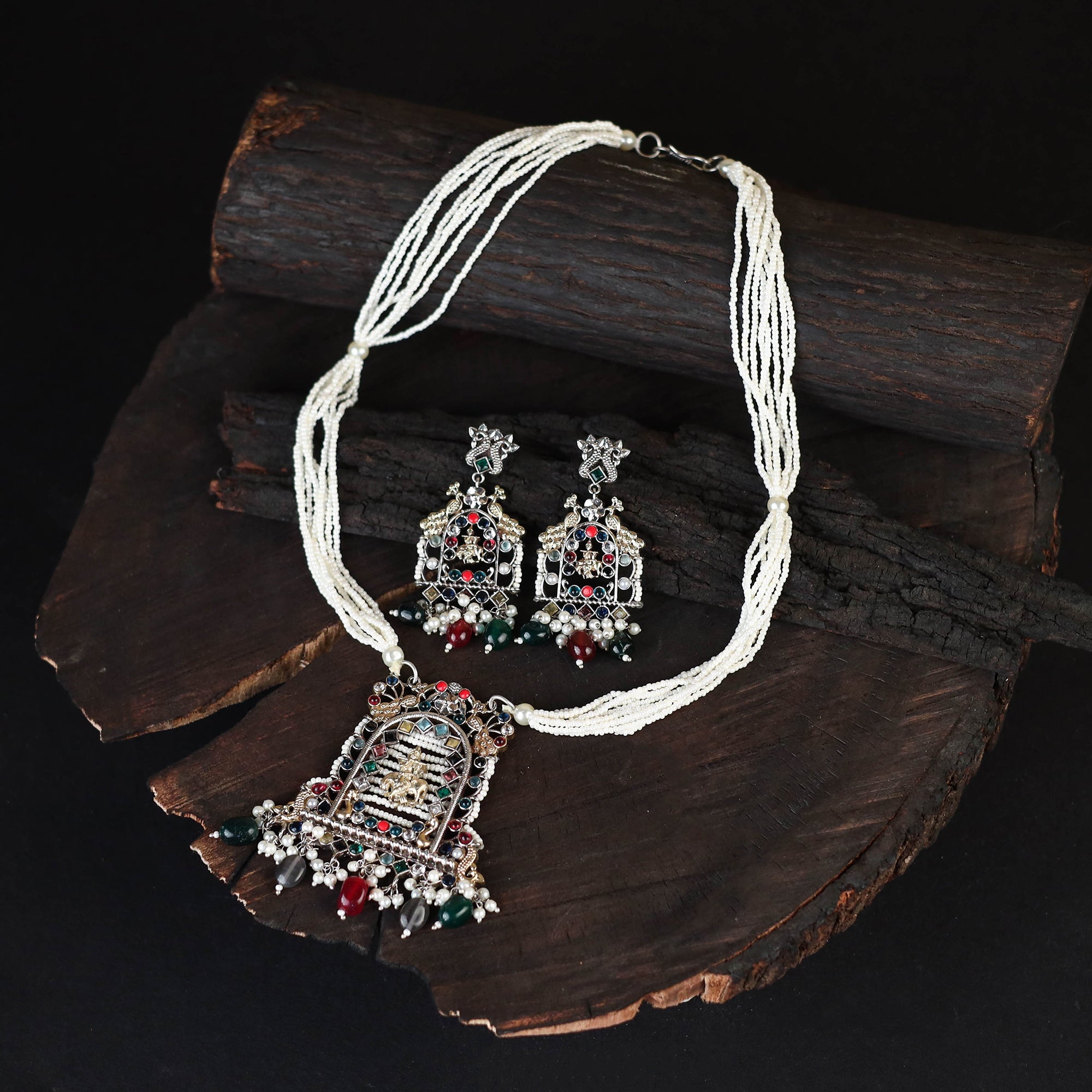This white german silver-plated handcrafted necklace set features a blend of oxidised metal, tiny pearls, stones, and intricate detailing. Known for its durability and subtle sheen, German silver adds a refined charm to the set. Paired with matching earrings, its silvery hues beautifully complement both traditional Indian ensembles and contemporary Western wear. A thoughtful gift for your loved ones, it brings a graceful touch of tradition to every moment.