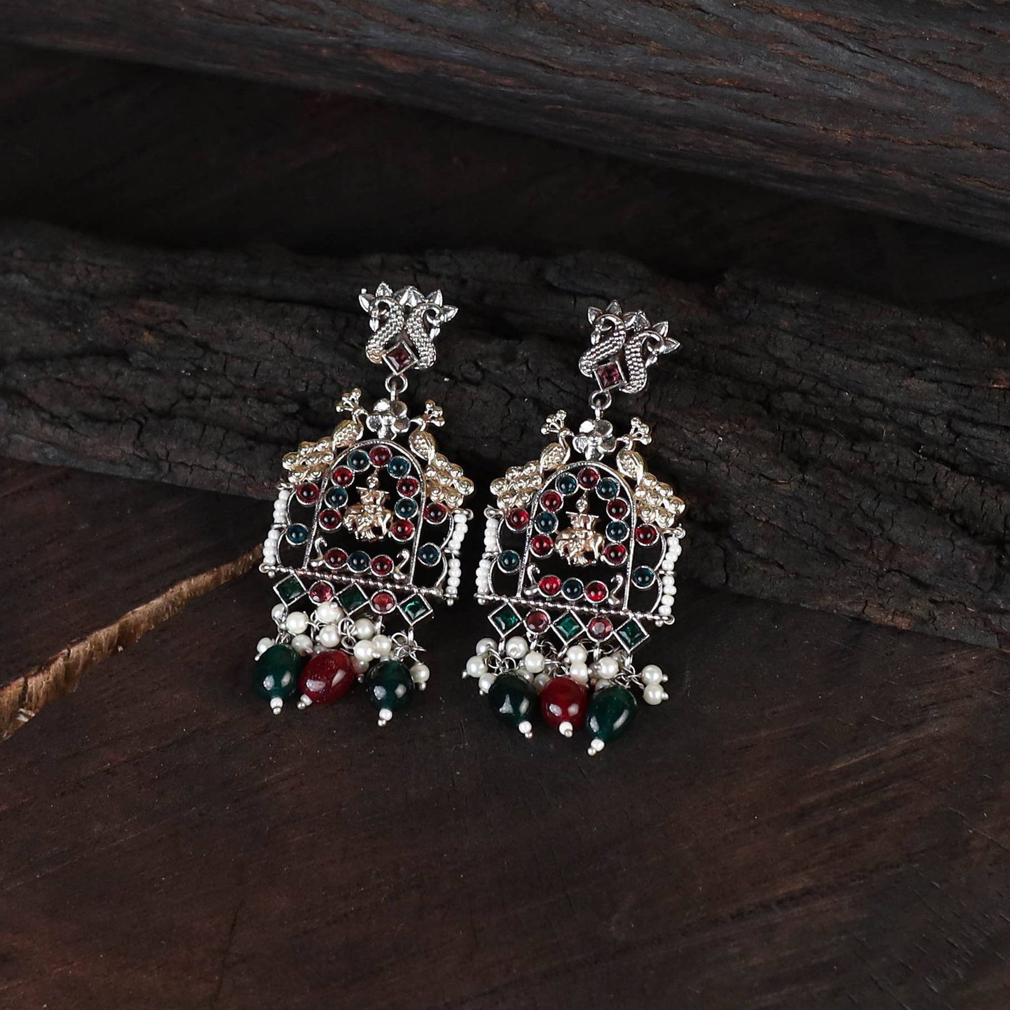 This white german silver-plated handcrafted necklace set features a blend of oxidised metal, tiny pearls, stones, and intricate detailing. Known for its durability and subtle sheen, German silver adds a refined charm to the set. Paired with matching earrings, its silvery hues beautifully complement both traditional Indian ensembles and contemporary Western wear. A thoughtful gift for your loved ones, it brings a graceful touch of tradition to every moment.