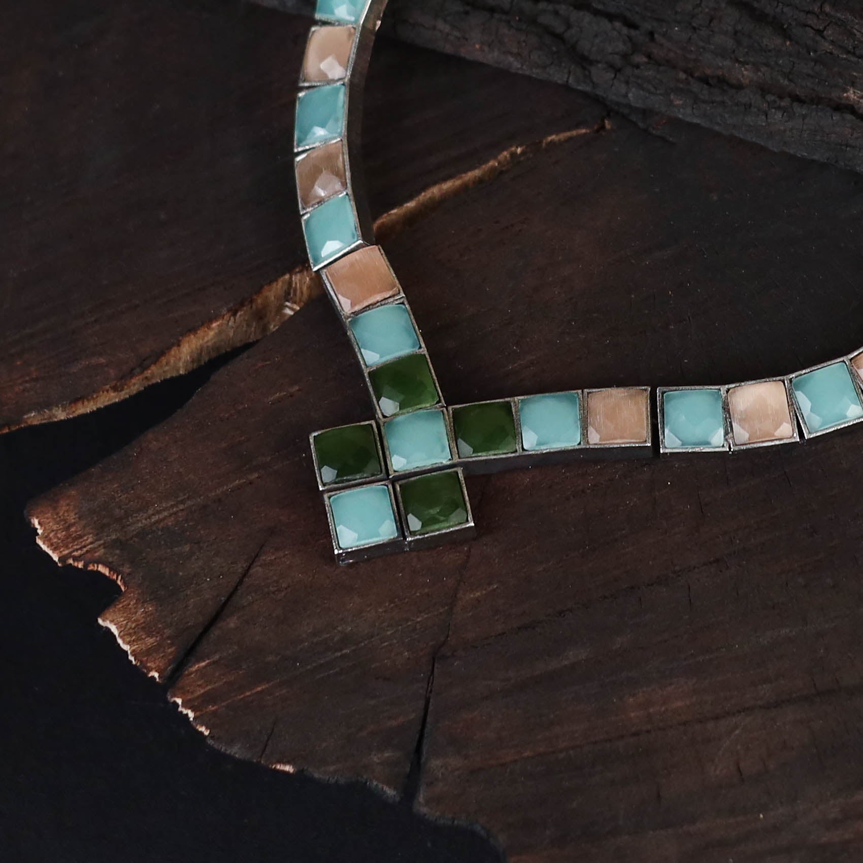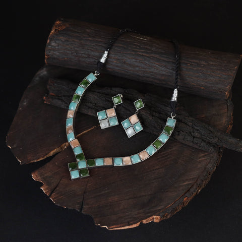 This multicolor german silver-plated handcrafted necklace set features a blend of oxidised metal, stones, and fine detailing. Known for its durability and subtle sheen, German silver lends an elegant charm to the set. Paired with matching earrings, its silver tones beautifully complement both traditional Indian ensembles and contemporary Western wear. A thoughtful gift for your loved ones, it brings a graceful touch of tradition to every moment.