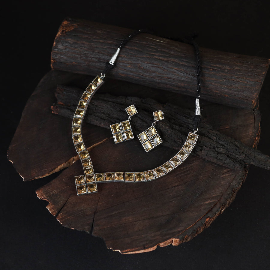 This yellow german silver-plated handcrafted necklace set features a blend of oxidised metal, stones, and fine detailing. Known for its durability and subtle sheen, German silver lends an elegant charm to the set. Paired with matching earrings, its silver tones beautifully complement both traditional Indian ensembles and contemporary Western wear. A thoughtful gift for your loved ones, it brings a graceful touch of tradition to every moment.