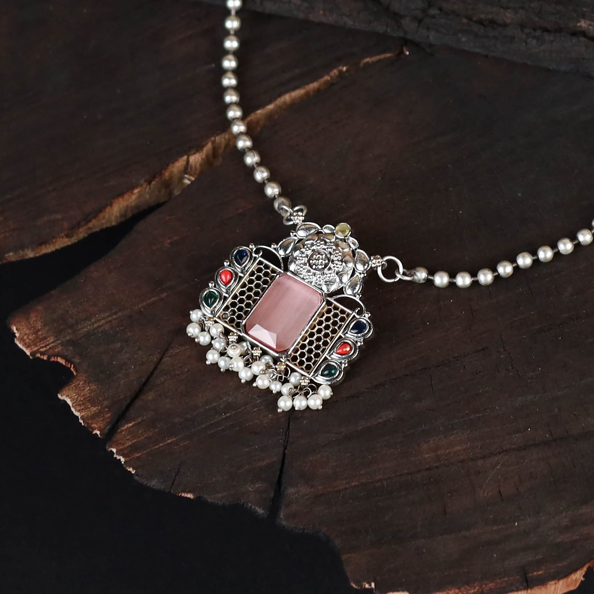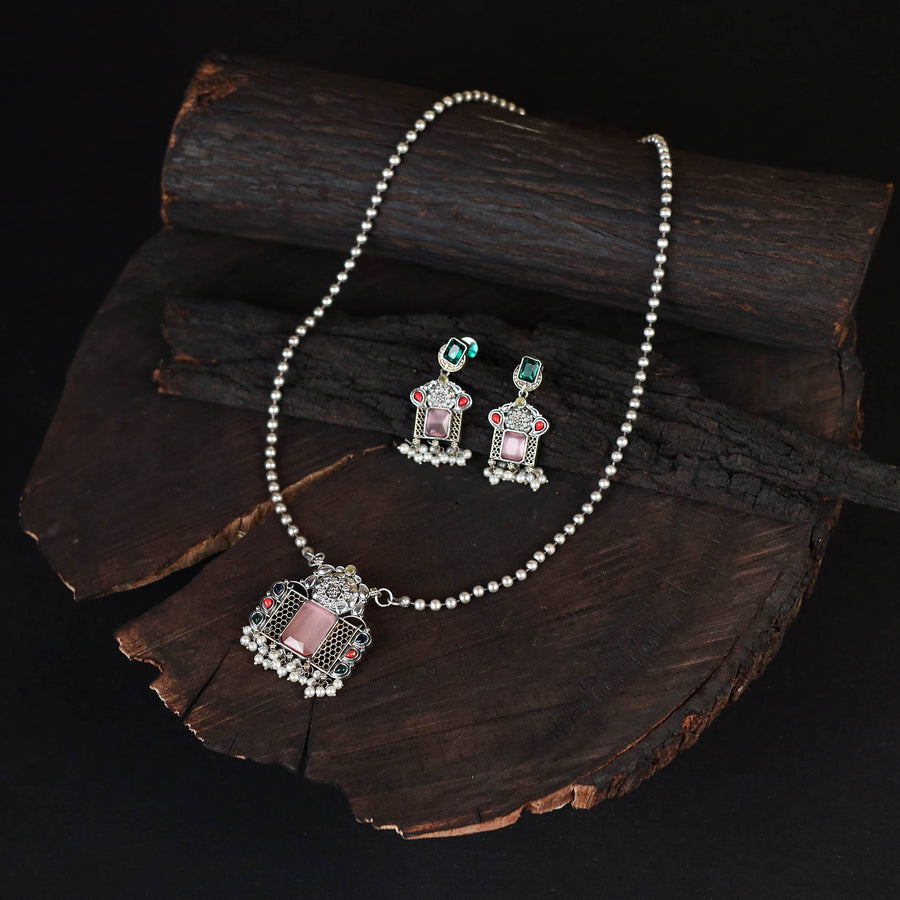 This pink german silver-plated handcrafted necklace set features a blend of oxidised metal, tiny pearls, stones, and intricate detailing. Known for its durability and subtle sheen, German silver adds a refined charm to the set. Paired with matching earrings, its silvery hues beautifully complement both traditional Indian ensembles and contemporary Western wear. A thoughtful gift for your loved ones, it brings a graceful touch of tradition to every moment.