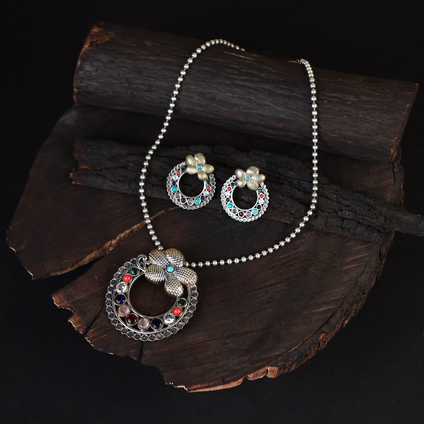 This multicolor german silver-plated handcrafted necklace set features a blend of oxidised metal, stones, and fine detailing. Known for its durability and subtle sheen, German silver lends an elegant charm to the set. Paired with matching earrings, its silver tones beautifully complement both traditional Indian ensembles and contemporary Western wear. A thoughtful gift for your loved ones, it brings a graceful touch of tradition to every moment.