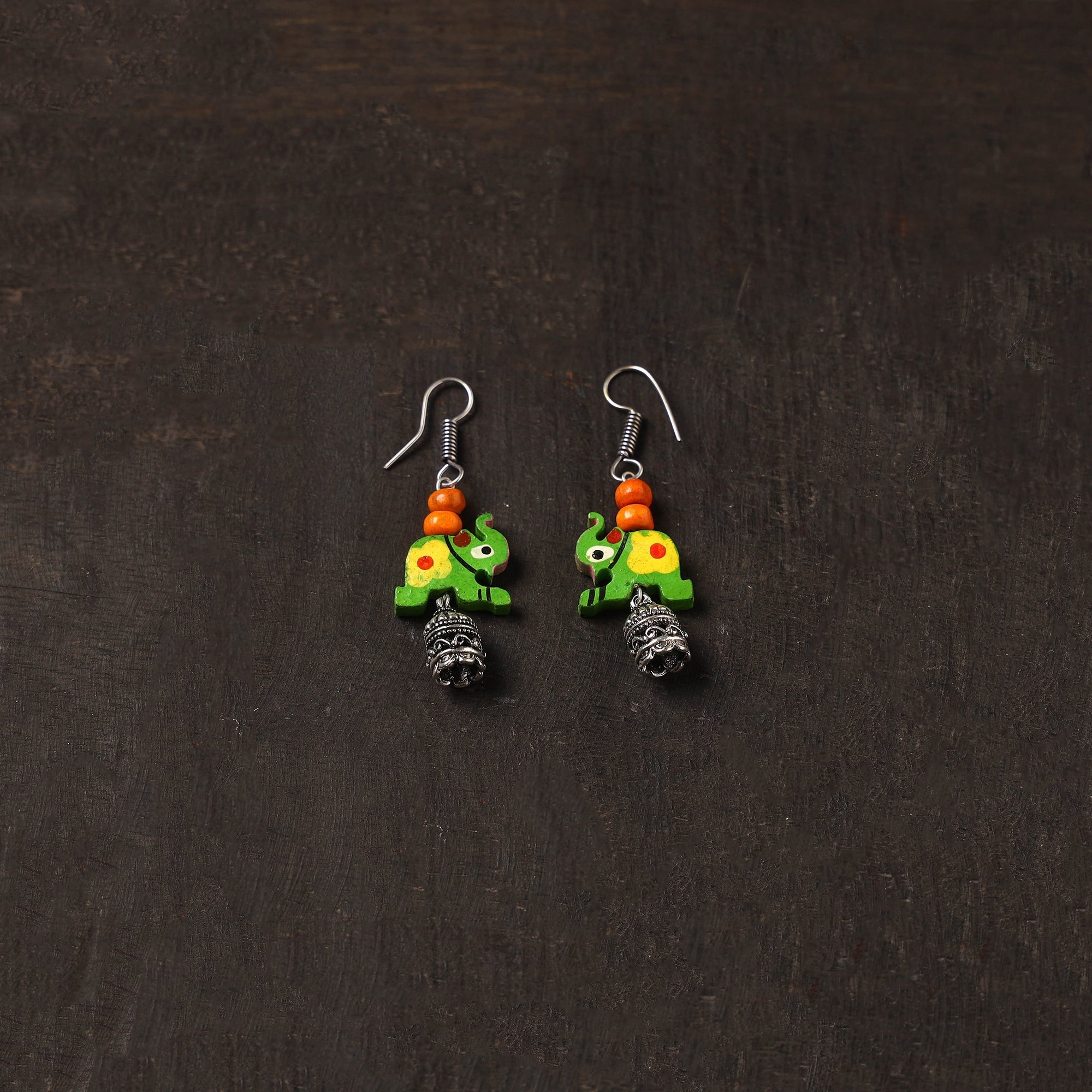 Handcrafted german silver jhumki earrings are beautifully detailed with green wooden elephant and beads. Made by women skilled artisans, they offer a lightweight and perfect for adding a unique charm to festive and everyday looks. German silver adds durability and is known for its strong, long-lasting finish.