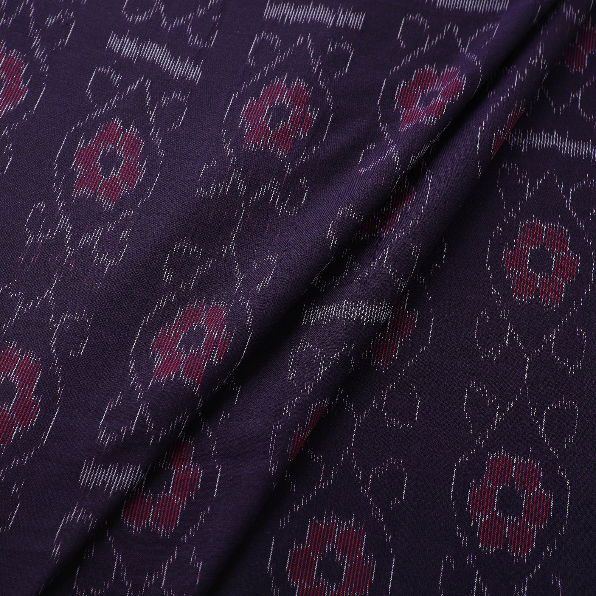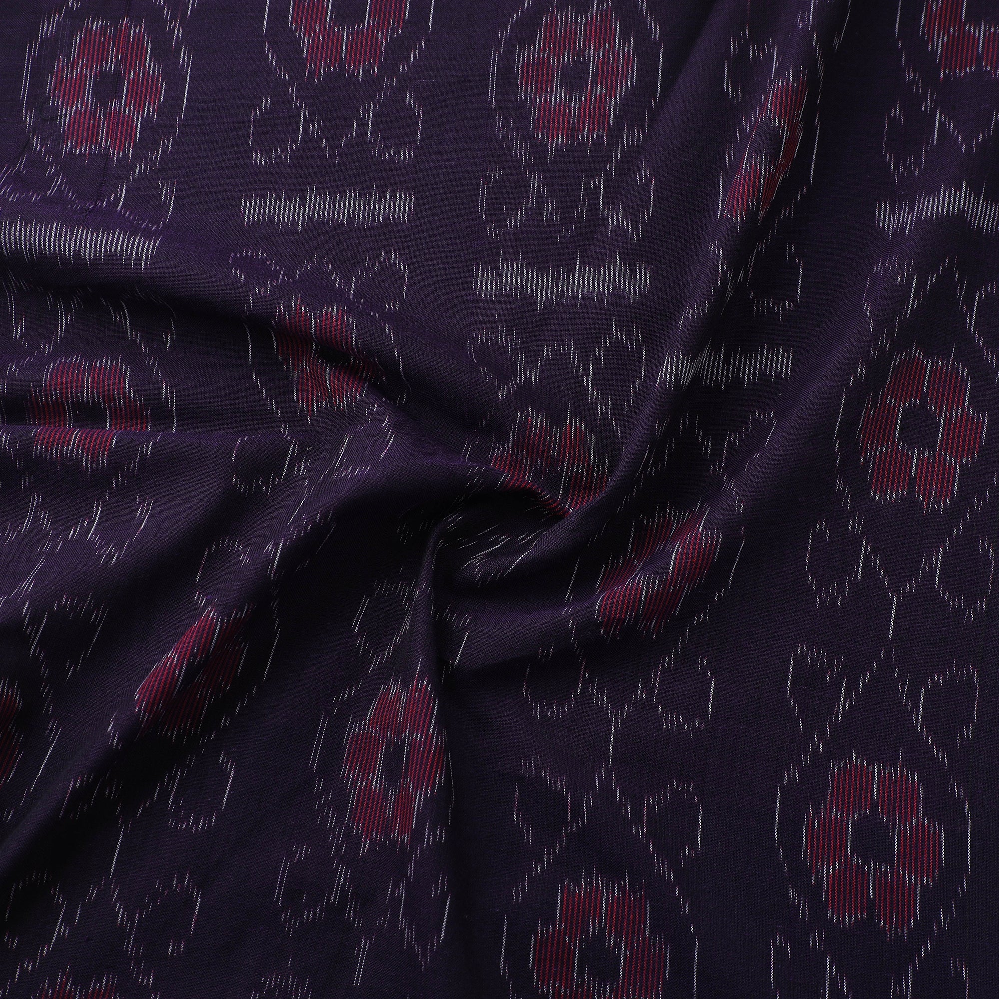 Fine quality purple sambalpuri Ikat weave cotton fabric from Odisha, featuring traditional motifs like shankha, chakra, and phula, crafted by master artisans from the eastern states of India. Ikat is a dyeing technique that uses a resist-dyeing process, similar to tie-dye, on either the warp or weft threads before weaving. The fabric is breathable and easy to work with, making it ideal for creating kurtas, dresses, or home décor.