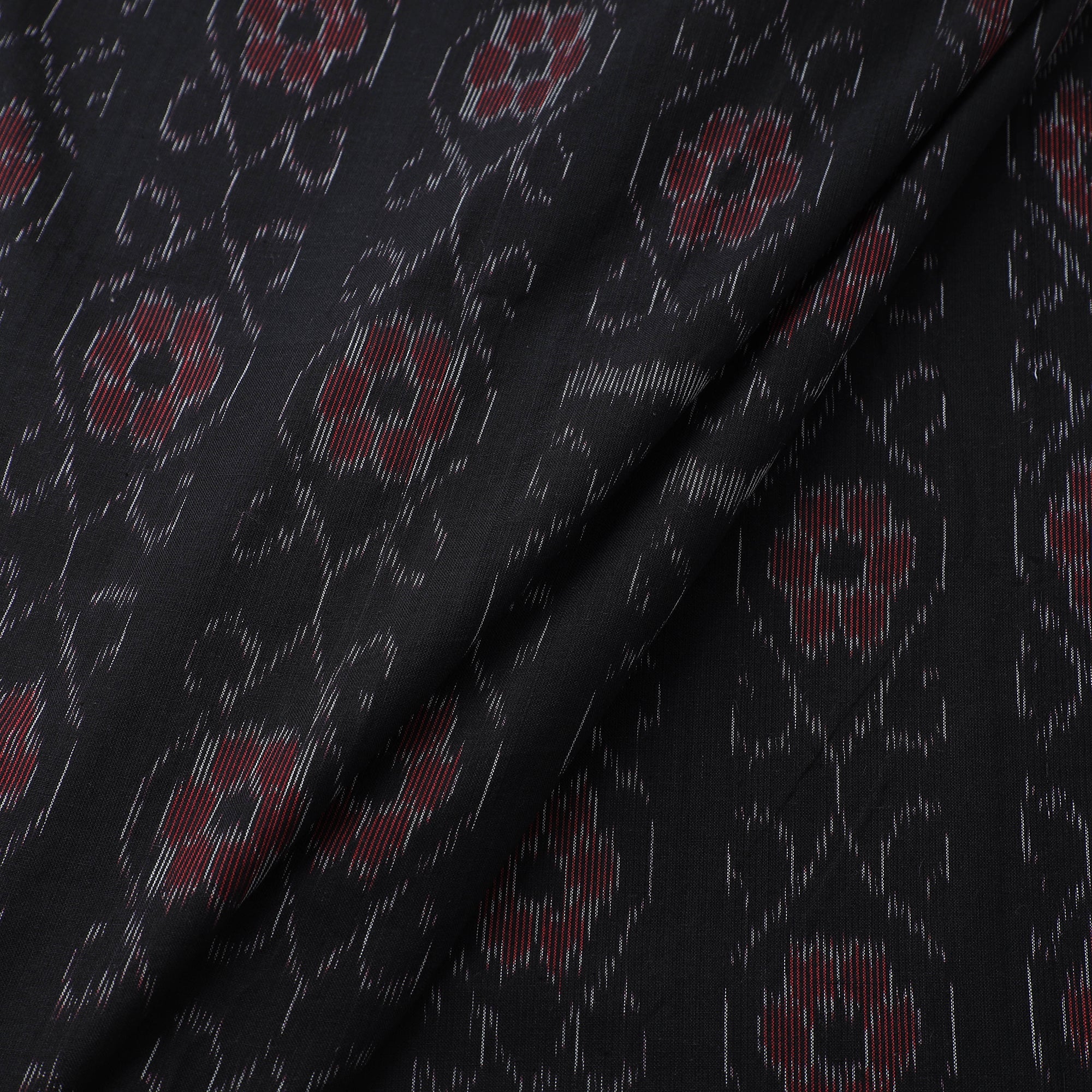 Fine quality black sambalpuri Ikat weave cotton fabric from Odisha, featuring traditional motifs like shankha, chakra, and phula, crafted by master artisans from the eastern states of India. Ikat is a dyeing technique that uses a resist-dyeing process, similar to tie-dye, on either the warp or weft threads before weaving. The fabric is breathable and easy to work with, making it ideal for creating kurtas, dresses, or home décor.