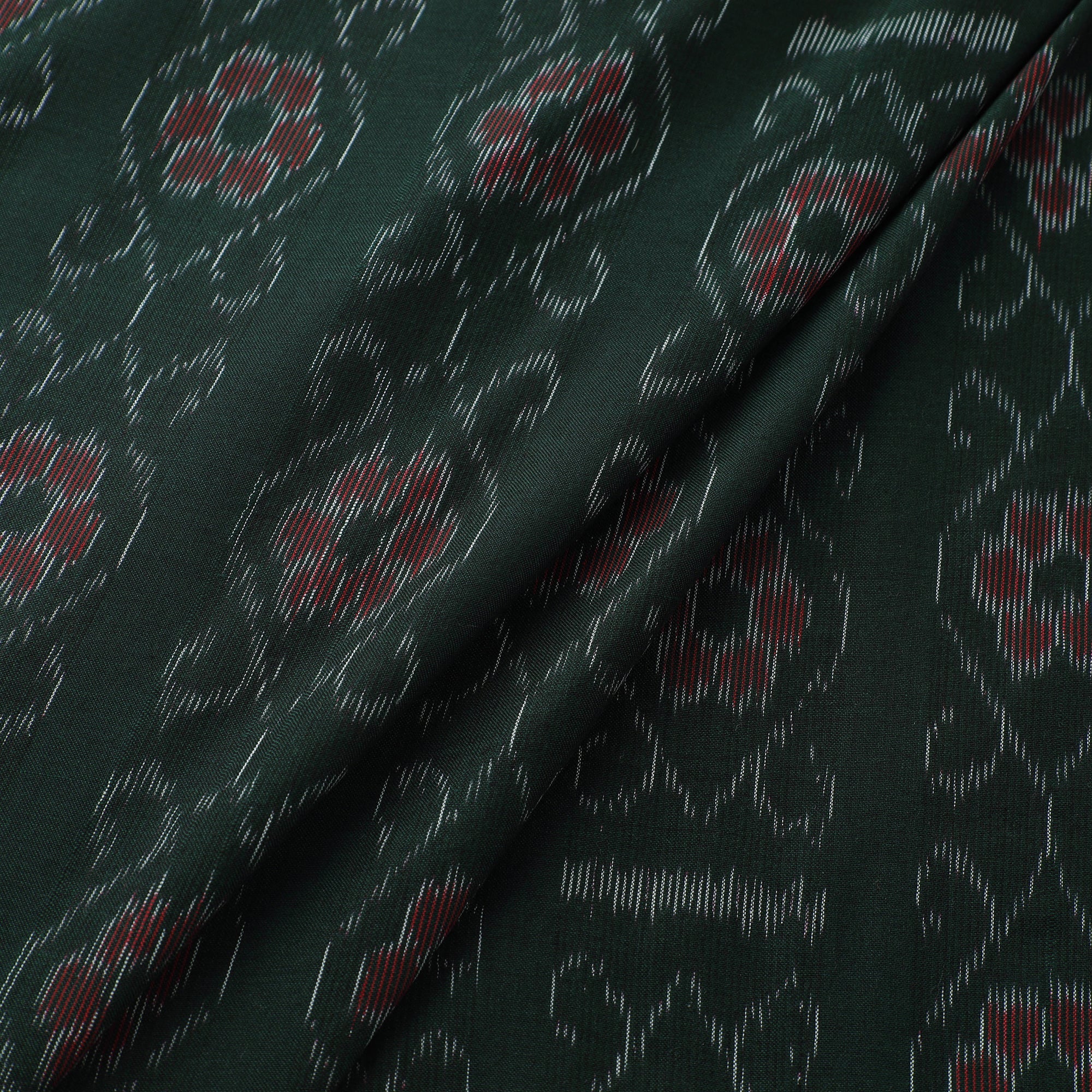 Fine quality green sambalpuri Ikat weave cotton fabric from Odisha, featuring traditional motifs like shankha, chakra, and phula, crafted by master artisans from the eastern states of India. Ikat is a dyeing technique that uses a resist-dyeing process, similar to tie-dye, on either the warp or weft threads before weaving. The fabric is breathable and easy to work with, making it ideal for creating kurtas, dresses, or home décor.