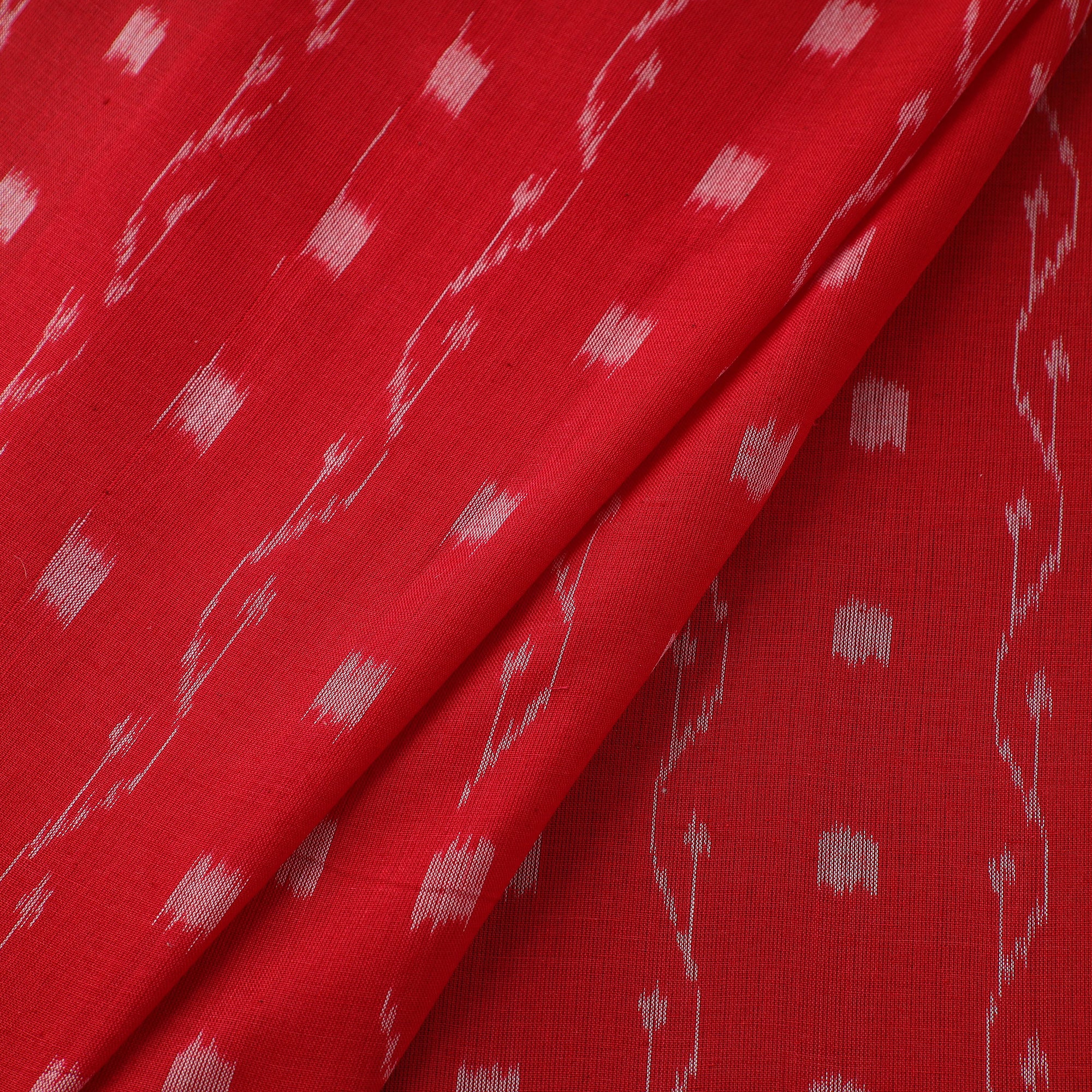 Fine quality red sambalpuri Ikat weave cotton fabric from Odisha, featuring traditional motifs like shankha, chakra, and phula, crafted by master artisans from the eastern states of India. Ikat is a dyeing technique that uses a resist-dyeing process, similar to tie-dye, on either the warp or weft threads before weaving. The fabric is breathable and easy to work with, making it ideal for creating kurtas, dresses, or home décor.