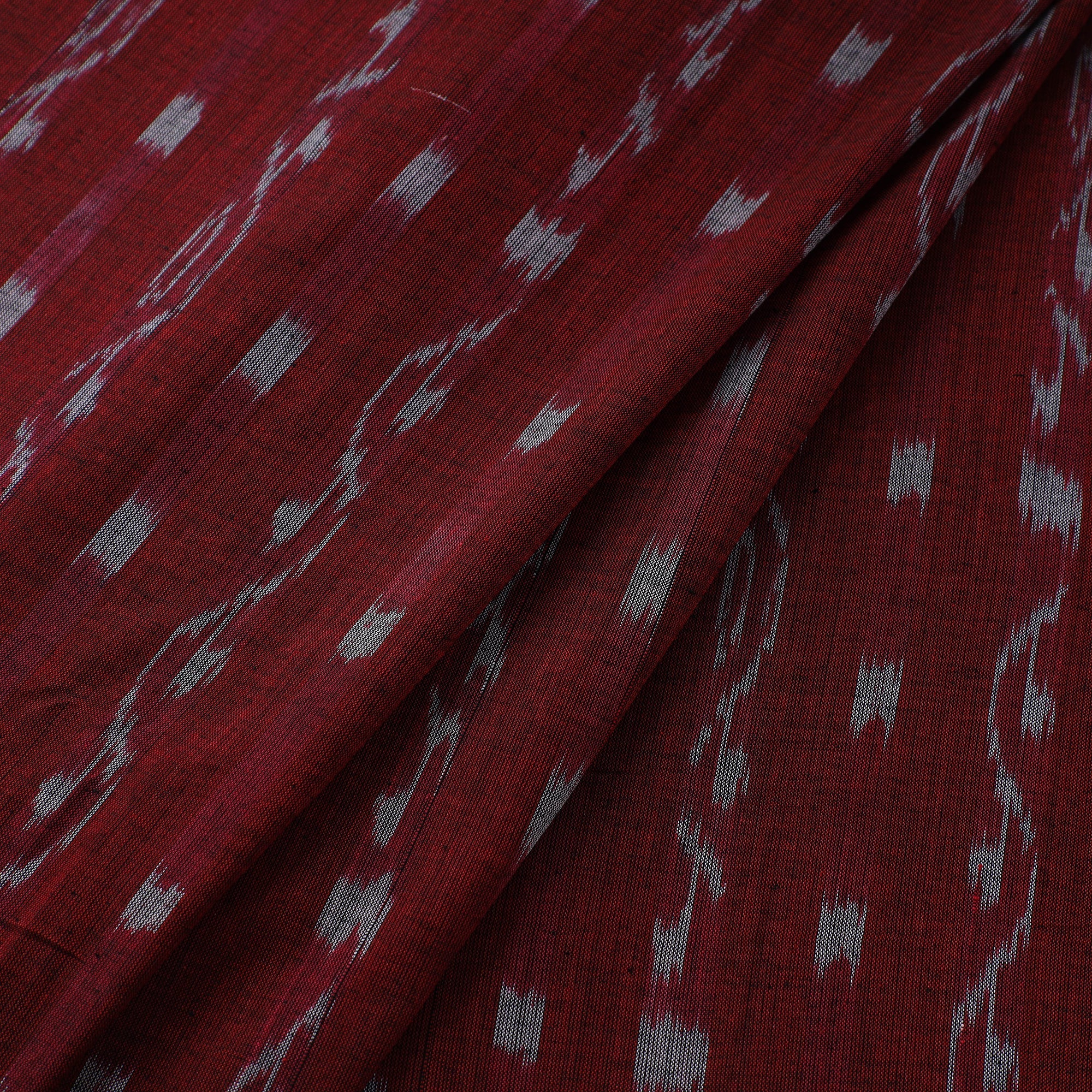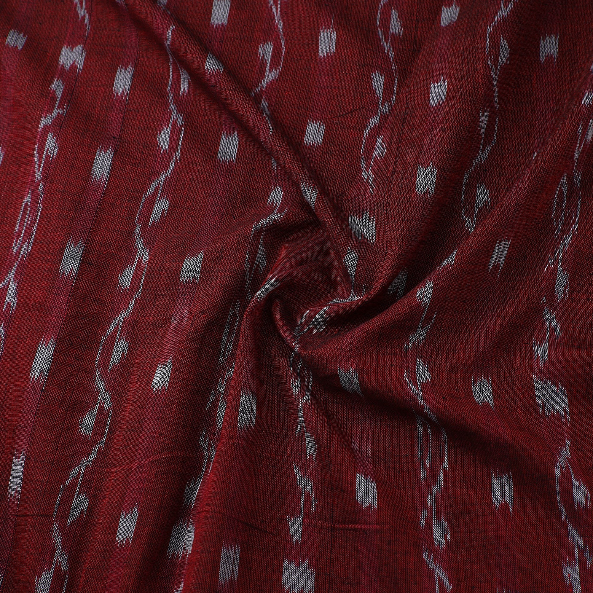 Fine quality maroon sambalpuri Ikat weave cotton fabric from Odisha, featuring traditional motifs like shankha, chakra, and phula, crafted by master artisans from the eastern states of India. Ikat is a dyeing technique that uses a resist-dyeing process, similar to tie-dye, on either the warp or weft threads before weaving. The fabric is breathable and easy to work with, making it ideal for creating kurtas, dresses, or home décor.