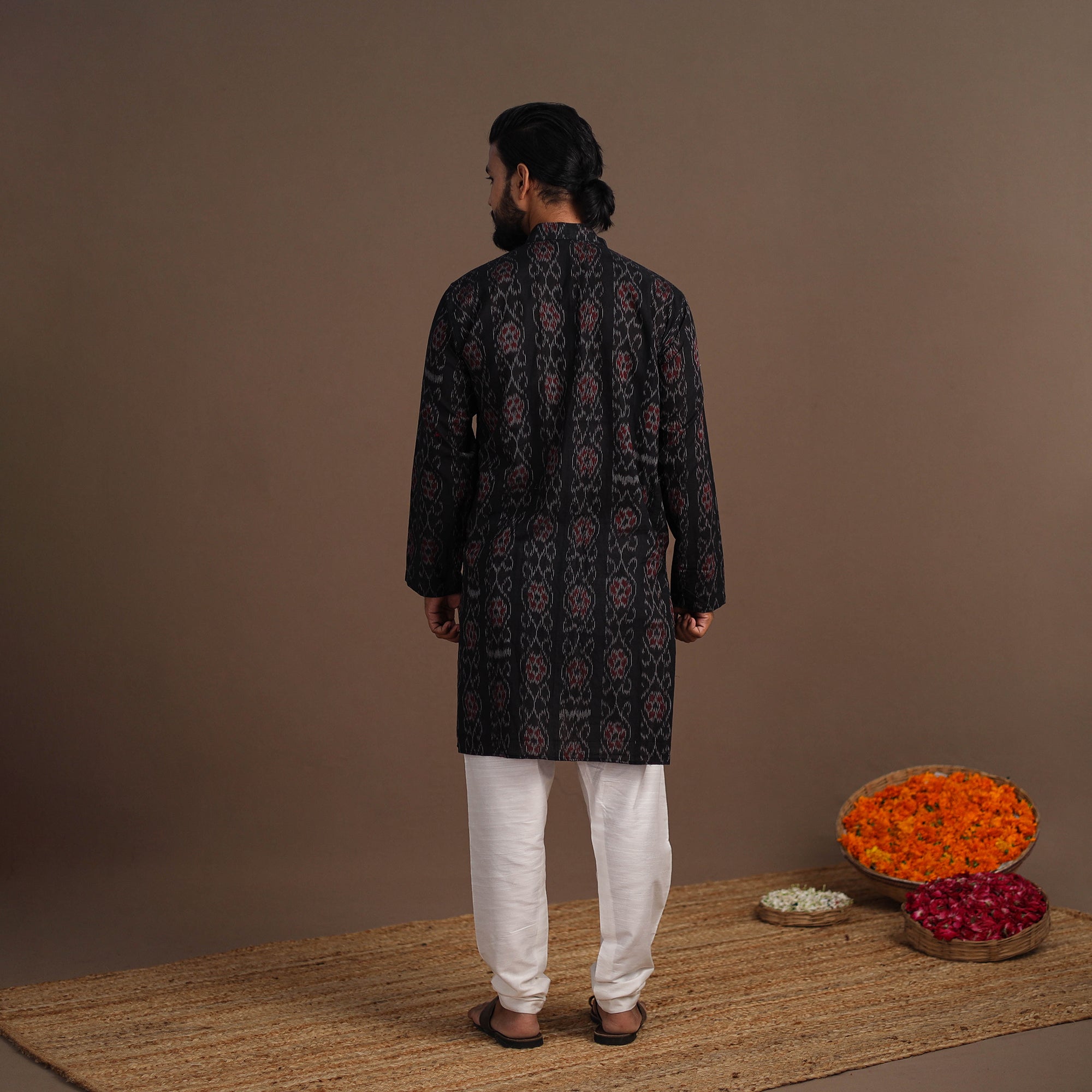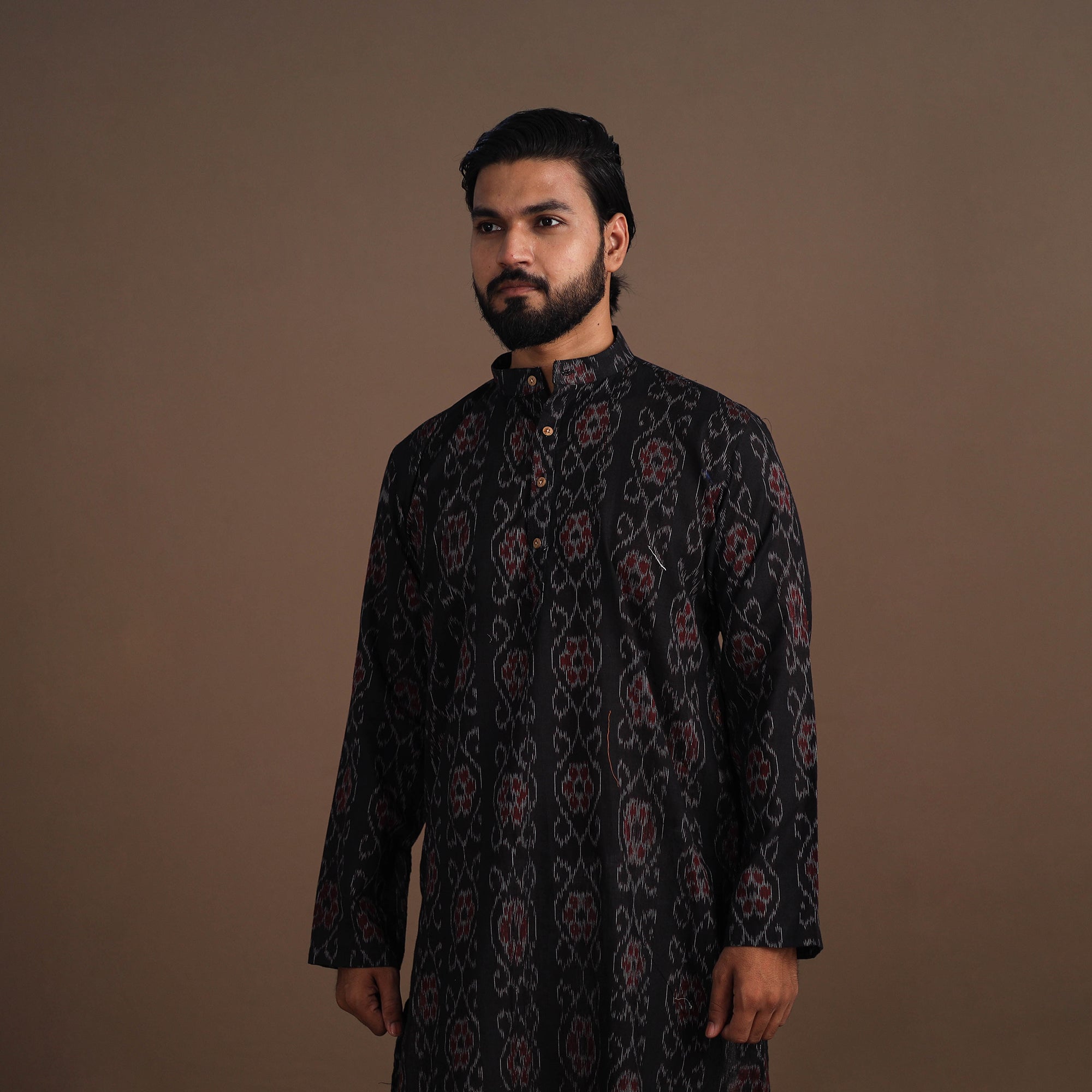 Enhance your style with our black sambalpuri ikat weave cotton men long kurta. Made from authentic sambalpuri ikat cotton fabric, this casual yet elegant kurta Ideal for daily outings or special occasions, this kurta blends style and comfort effortlessly. It features full sleeves, a front button placket with a chinese collar, and two side pockets convenient for your daily essentials.