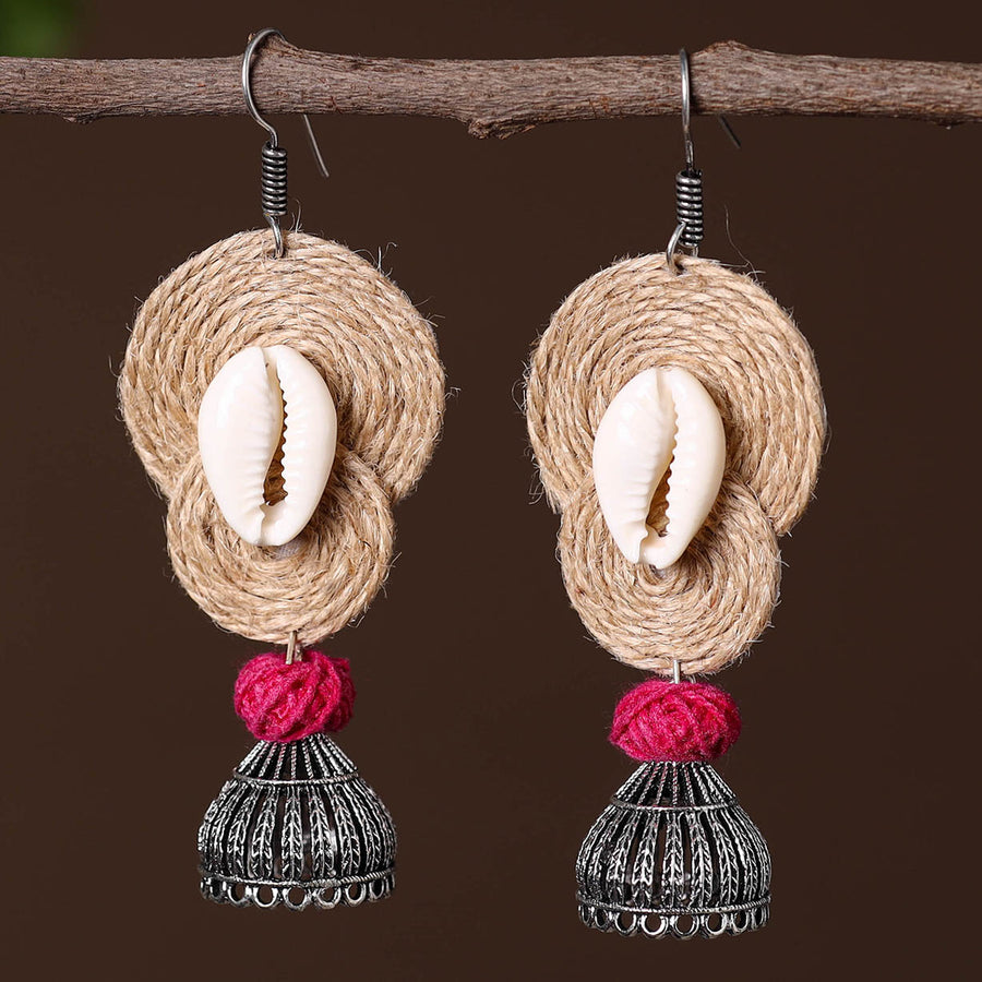 These beige handcrafted german silver jute jhumki earrings. Featuring intricate jute, seashell, and thread detailing, these earrings add a unique and vibrant touch to your look. Perfect for casual wear or festive occasions.
