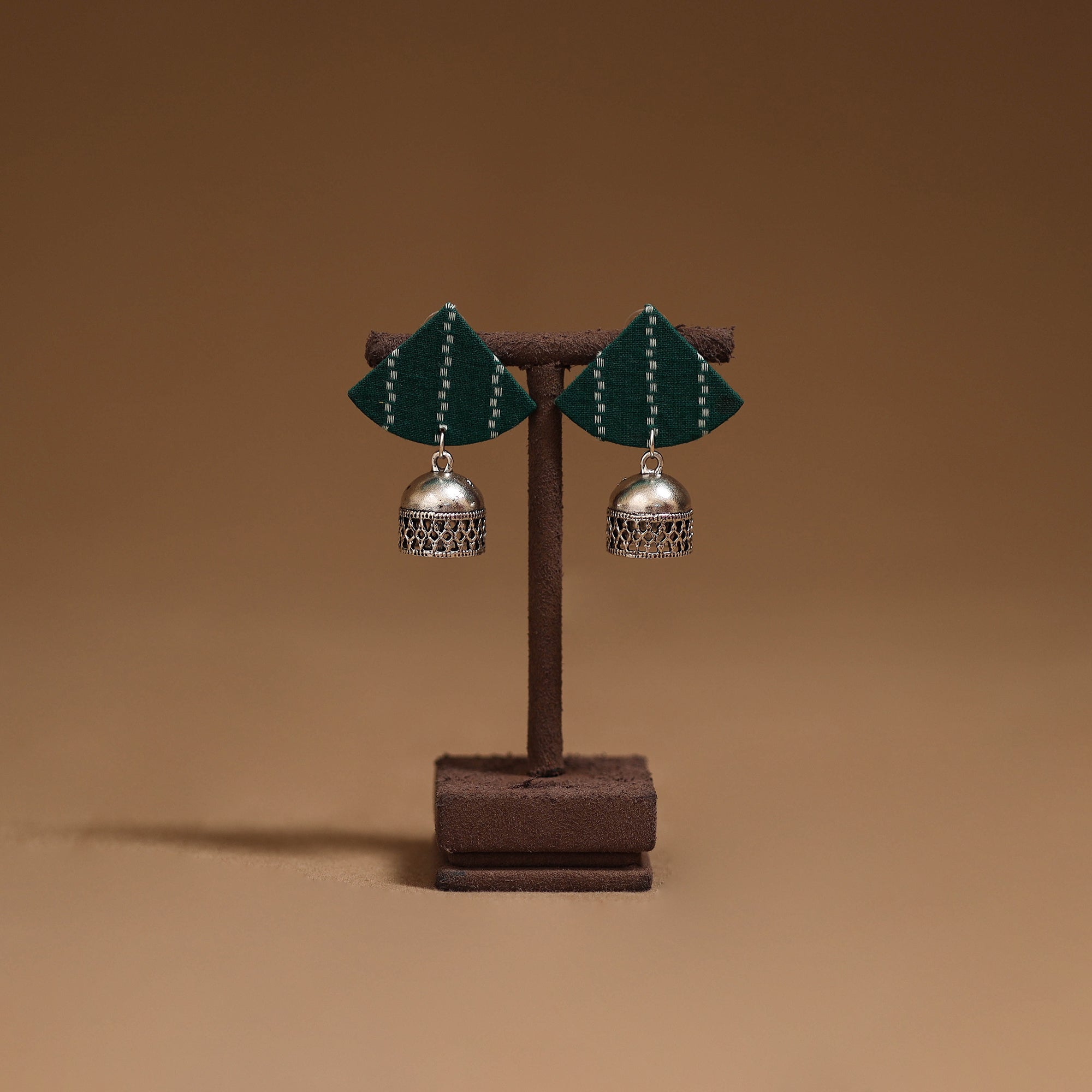 Handmade fabric earrings with german silver jhumki is attached at the end, that enhances its charm. Perfect for everyday wear or special occasions, these earrings blend traditional style with a graceful touch.